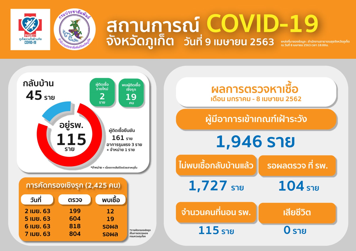 เมื่อวันที่ 9 เมษายน 2563 คณะกรรมการโรคติดต่อจังหวัดภูเก็ต แจ้งสถานการณ์โรคติดเชื้อไวรัสโคโรนา 2019 (COVID-19) จังหวัดภูเก็ต ตั้งแต่วันที่ 5 มกราคม -8 เมษายน 2563 มีผู้ป่วยยืนยันโรคโควิด - 19 จำนวน 161 ราย อาการรุนแรง 3 ราย จำหน่าย 1 ราย (จำหน่ายเนื่องจากเสียชีวิตด้วยสาเหตุอื่น) โดยผู้ป่วยรักษาหายกลับบ้าน 45 ราย กำลังรักษาพยาบาลอยู่ 115 ราย (พบผู้ติดเชื้อเชิงรุก 19 คน ผู้ติดเชื้อ รายใหม่ 2 ราย) ผู้มีอาการเข้าเกณฑ์เฝ้าระวัง 1,946 ราย ไม่พบเชื้อกลับบ้านแล้ว 1,727 ราย รอผลตรวจที่โรงพยาบาล 104 ราย