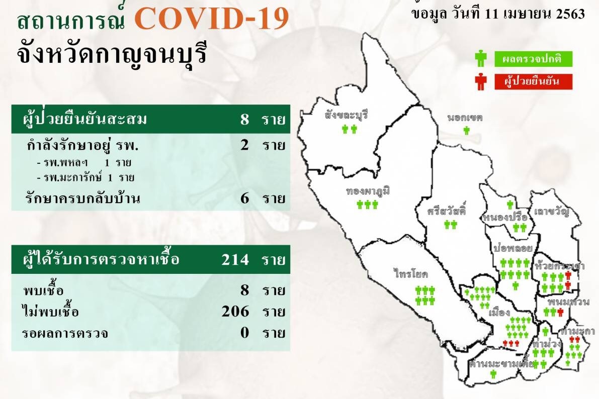 เมื่อวันที่ 11 เม.ย.63 สำนักงานสาธารณสุขจังหวัดกาญจนบุรี รายงานสถานการณ์โควิด-19 ประจำวันที่ 11 เม.ย.63 ไม่พบผู้ป่วยเพิ่ม มีผู้ป่วยยืนยันสะสม 8 ราย รักษาครบกลับบ้านแล้ว6 ราย กำลังรักษาอยู่ รพ.พหลพลพยุหเสนา 1 ราย รพ.มะการักษ์ 1 ราย ผู้ได้รับการตรวจหาเชื้อ 241 ราย ไม่พบเชื้อ 206 ราย