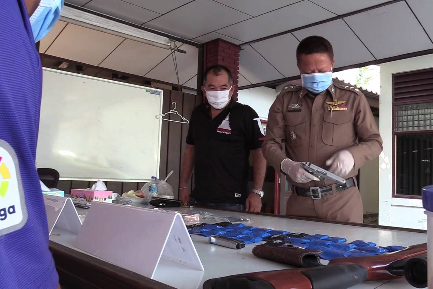 เมื่อวันที่ 12 เม.ย. 63 กองบังคับการตำรวจภูธรจังหวัดนครศรีธรรมราช พ.ต.อ.เชาวศิลป์ บุญประดิษฐ์ รองผู้บังคับการฯ และ พ.ต.อ.รังสรรค์ สุขเกื้อ ผกก.สส.ภ.นครศรีธรรมราช ได้สอบปากคำ 2 ผู้ต้องหาคดีค้ายาเสพติดหลังจับกุม 2 สามีภรรยาขับรถแหกด่านตรวจคัดกรองผู้ป่วยโควิด-19 ในท้อง อ.ทุ่งสง เมื่อคืนที่ผ่านมา และนำตัวมาสอบสวนขยายผลจับกุมตัวผู้ต้องหาได้อีก 2 คน พร้อมของกลางยาบ้า 6 พันเม็ด อาวุธปืน 2 กระบอก และเงินสดเกือบ 1 แสนบาท