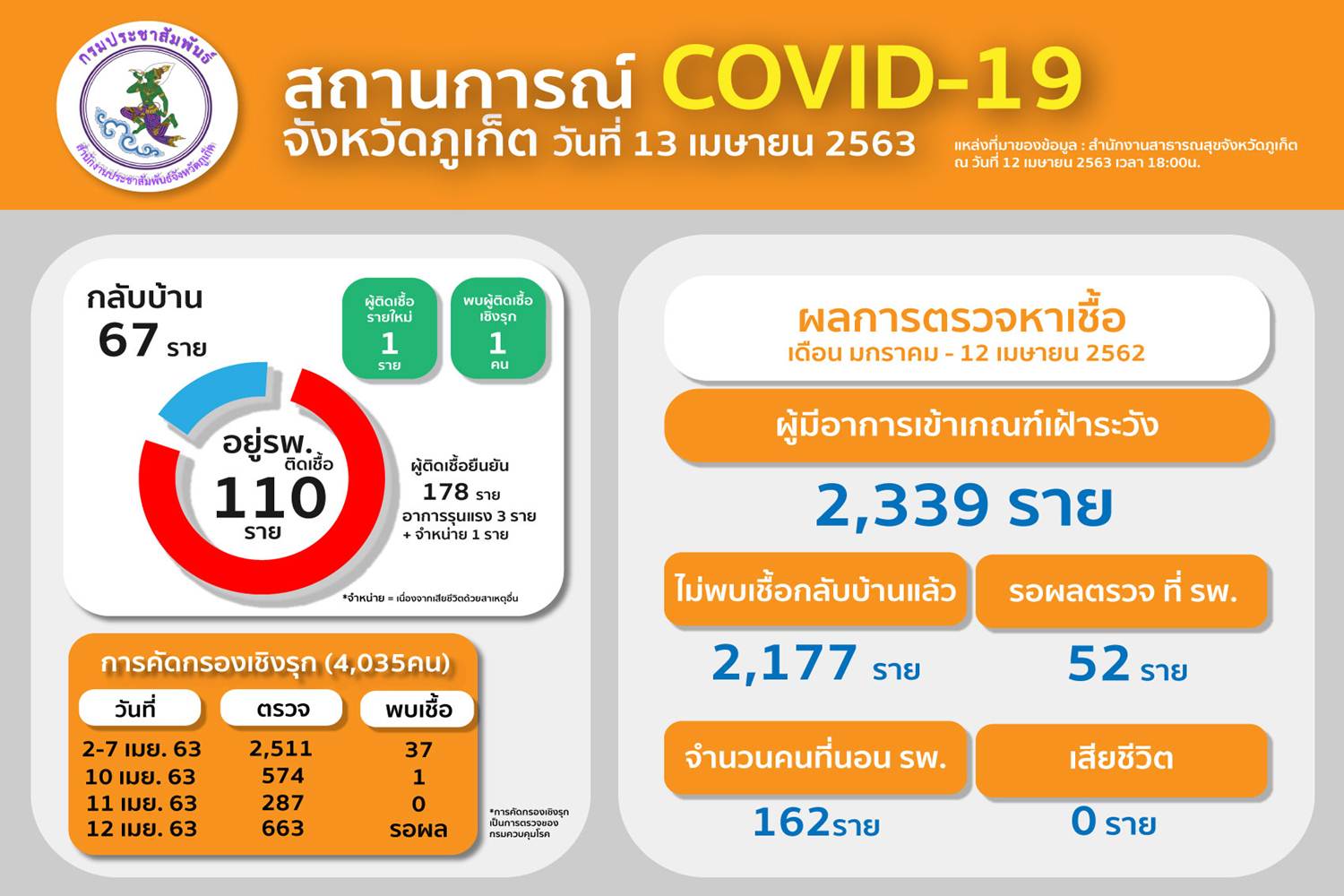 เมื่อวันที่ 13 เม.ย.63 คณะกรรมการโรคติดต่อจังหวัดภูเก็ต แจ้งสถานการณ์โรคติดเชื้อไวรัสโคโรนา 2019 (โควิด -19) จังหวัดภูเก็ต ข้อมูล ตั้งแต่วันที่ 5 มกราคม – 12 เมษายน 2563 จังหวัดภูเก็ตมีผู้ป่วยยืนยันโรคโควิด-19 แล้วจำนวน 178 ราย (รายใหม่ 1 ราย และตรวจคัดกรองเชิงรุก 1 ราย) โดยผู้ป่วยรักษาหายกลับบ้าน 67 ราย จำหน่าย 1 ราย (จำหน่าย เนื่องด้วยเสียชีวิตจากอุบัติเหตุรถจักรยานยนต์) กำลังรักษาพยาบาลอยู่ 110 ราย ในจำนวนนี้ อาการรุนแรง 3 ราย ไม่มีผู้เสียชีวิต ที่เหลืออาการอยู่ในเกณฑ์ที่ดี ทั้งนี้ผู้ป่วยทั้ง 178 รายนี้รวมอยู่ในรายงานผู้ป่วยติดเชื้อยืนยันที่กระทรวงสาธารณสุขได้แถลงไปก่อนหน้านี้แล้ว