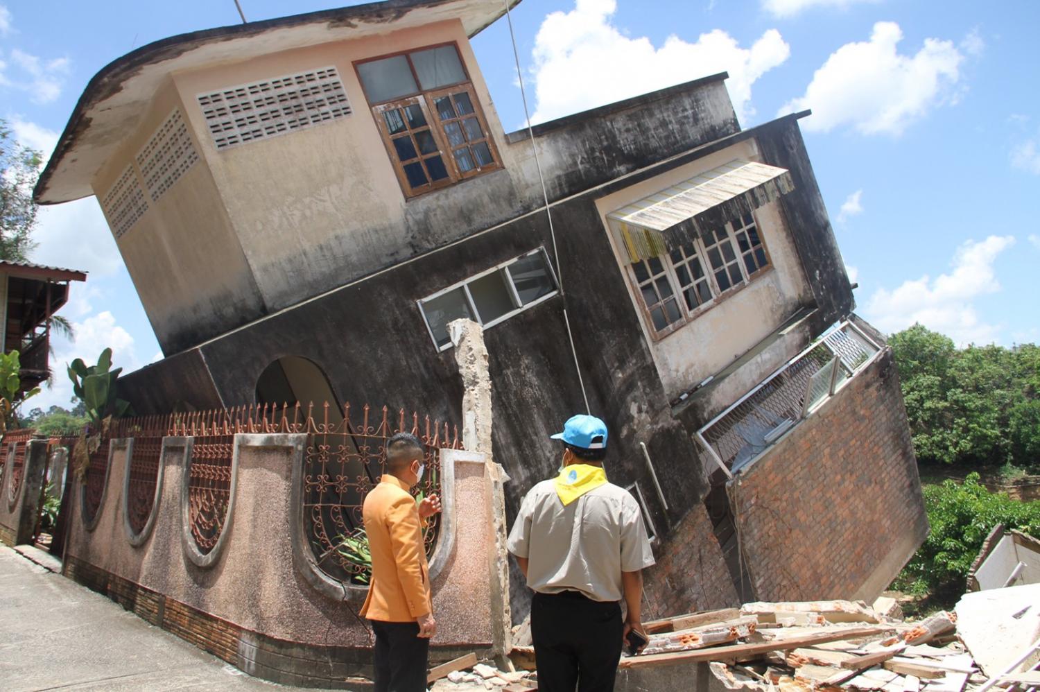 นครศรีธรรมราช-ผู้ว่าฯรุดให้กำลังใจชาวบ้านประสบเหตุบ้านทรุด 3 หลังรวดในชุมชนตลาดล่างเขตเทศบาลตำบลชะอวด ขณะที่ทางจังหวัดเร่งหางบมาช่วยเหลือ