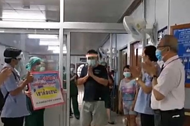 เมื่อวันที่ 24 เมษายน 2563 นายแพทย์อภิชาต วิสิทธิ์วงษ์ รองผู้อำนวยการฝ่ายการแพทย์ นายแพทย์ถนอม จิวสืบพงษ์ หัวหน้ากลุ่มงานอายุรกรรม นายแพทย์วิทยา หวังสมบูรณ์ศิริ อายุรแพทย์โรคติดเชื้อ หัวหน้ากลุ่มงานป้องกันและควบคุมโรคติดเชื้อ โรงพยาบาลสวรรค์ประชารักษ์ พร้อมด้วยบุคลากรทางการแพทย์ร่วมส่งตัวผู้ป่วยโควิด-19 รายที่ 3 และ รายที่ 4 กลับบ้าน โดยมีแพทย์ พยาบาล และเจ้าหน้าที่ฯ ร่วมแสดงความยินดีและให้กำลังใจ