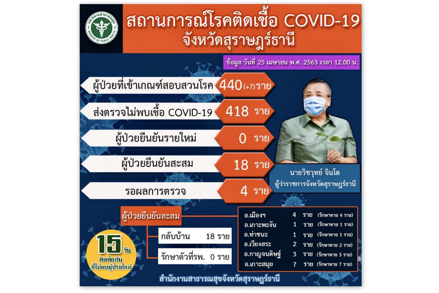 นายวิชวุทย์ จินโต ผู้ว่าราชการจังหวัดสุราษฎร์ธานี กล่าวว่า ได้รับรายงานจากสาธารณสุขจังหวัดว่าผู้ป่วย 4 รายสุดท้ายที่ อ.เกาะสมุย เป็นครอบครัว(แม่,ลูกชาย,ลูกสาวและพ่อ)แพทย์รักษาหายออกโรงพยาบาลไปเข้าศูนย์กักกันที่โรงแรมริมชายทะเล(Hotel Quarantine)อีก14วันรวม 28 วัน ซึ่งเป็นข่าวดีของชาวสุราษฎร์ธานีที่ผู้ป่วยรายใหม่และผู้ป่วยสะสมทั้งหมดเป็นศูนย์ โดยผู้ป่วยทั้ง 18 รายรักษาหายหมด เป็นชาวต่างชาติถึง 3 ราย ผู้หญิงชาวเบลเยี่ยม 1 รายที่เกาะพะงัน ผู้ชายชาวฝรั่งเศส 2 รายที่เกาะสมุย