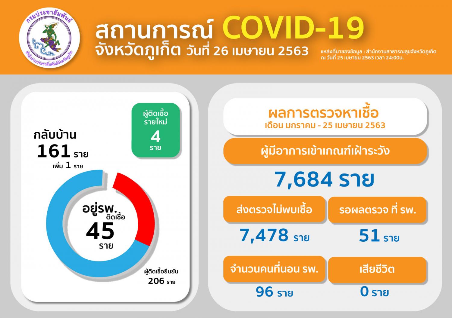 เมื่อวันที่ 26 เมษายน คณะกรรมการโรคติดต่อจังหวัดภูเก็ต แจ้งสถานการณ์โรคติดเชื้อไวรัสโควิด-19 ตั้งแต่วันที่ 5 มกราคม – 25 เมษายน 2563 จังหวัดภูเก็ตมีผู้ติดเชื้อยืนยันโรคโควิด-19 แล้วจำนวน 206 ราย (รายใหม่ 4 ราย) โดยผู้ติดเชื้อได้รับอนุญาตให้กลับบ้าน 161 ราย (เพิ่มขึ้นจากเดิม 1 ราย) กำลังรักษาพยาบาลอยู่ 45 ราย ในจำนวนนี้ อาการรุนแรง 4 ราย ไม่มีผู้เสียชีวิต ที่เหลืออาการอยู่ในเกณฑ์ที่ดีอยู่ระหว่างรอผลการตรวจทางห้องปฏิบัติการ 51 ราย