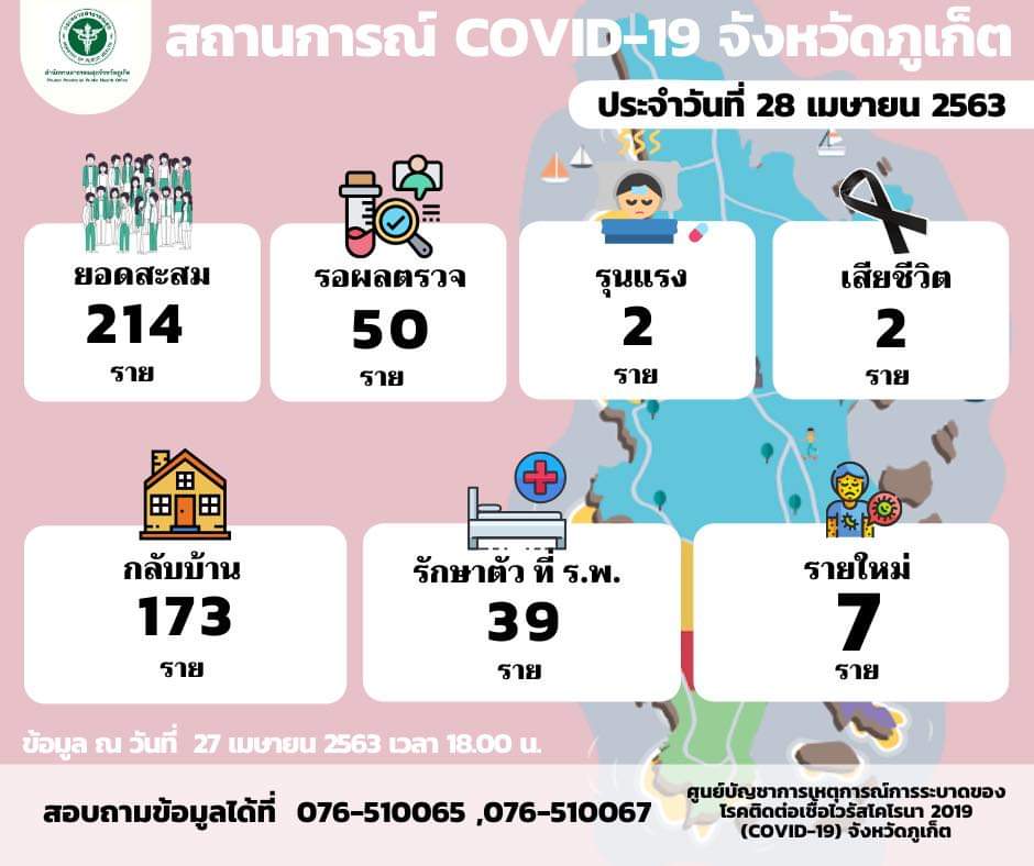 เมื่อวันที่ 28 เม.ย.คณะกรรมการโรคติดต่อจังหวัดภูเก็ต แจ้งสถานการณ์โรคติดเชื้อโควิด-19 จังหวัดภูเก็ตข้อมูล ตั้งแต่วันที่ 5 ม.ค.– 27 เม.ย.2563 จังหวัดภูเก็ตมีผู้ติดเชื้อยืนยันโรคโควิด-19 แล้ว จำนวน 214 ราย (รายใหม่ 7 ราย) เสียชีวิต 2 ราย