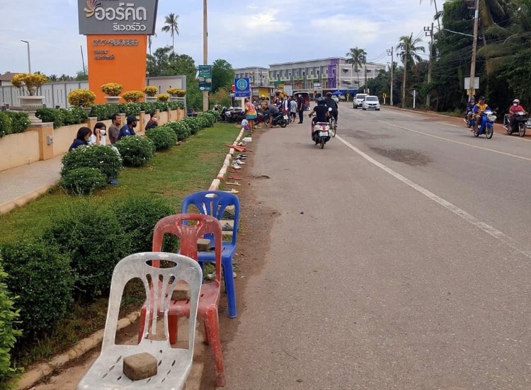 เมื่อวันที่ 28 เมษายน ที่บริเวณหน้าโรงแรมออร์คิดริเวอร์วิว ถนนสายในบาง ต.บางใบไม้ อ.เมือง จ.สุราษฎร์ธานี ซึ่งในเวลา 16.30 น.ทางโรงแรมมีกำหนดจะแจกข้าวสาร 5 กิโลกรัมและอาหารแห้ง จำนวน 400 ชุด ให้ประชาชนเพื่อช่วยเหลือที่ได้รับผลกระทบจากโรคโควิด-19 โดยแจกบัตรคิวในเวลา 14.00 น.ปรากฏว่า ตั้งแต่เวลา 07.00 น.มีประชาชนนำเก้าอี้วางทับด้วยก้อนอิฐ และรองเท้ามาวางเรียงรอคิวอย่างเป็นระเบียบเรียบร้อยเป็นแถวยาวหลายร้อยเมตร
