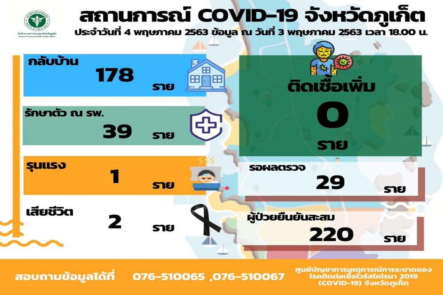 เมื่อวันที่ 4 พฤษภาคม คณะกรรมการโรคติดต่อจังหวัดภูเก็ต ขอแจ้งสถานการณ์โรคติดเชื้อไวรัสโคโรนา 2019 (COVID-19)จังหวัดภูเก็ตข้อมูล ตั้งแต่วันที่ 5 มกราคม – 3 พฤษภาคม 2563 จังหวัดภูเก็ตมีผู้ติดเชื้อยืนยันโรคโควิด-19 แล้วจำนวน 220 ราย (ไม่พบรายใหม่) โดยผู้ติดเชื้อได้รับอนุญาต ให้กลับบ้าน 178 ราย (กลับบ้านเพิ่ม 2 ราย) เสียชีวิต 2 ราย จำหน่าย 1 ราย (จำหน่าย เนื่องด้วยเสียชีวิตจากอุบัติเหตุรถจักรยานยนต์) กำลังรักษาพยาบาลอยู่ 39 ราย ในจำนวนนี้ อาการรุนแรง 1 ราย ที่เหลืออาการอยู่ในเกณฑ์ที่ดี