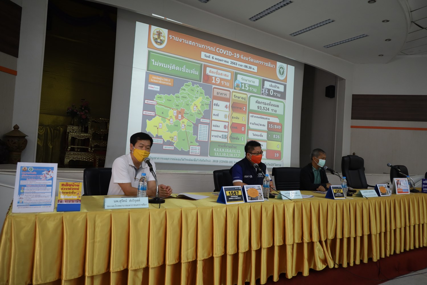 เมื่อวันที่ 6 พ.ค.ที่ศาลากลางจังหวัดนครราชสีมา นายศักดิ์สิทธิ์ สกุลลิขเรศสีมา รองผู้ว่าราชการจังหวัดนครราชสีมา พร้อมด้วย นพ.วิญญู จันทร์เนตร รองนายแพทย์สาธารณสุขจังหวัดนครราชสีมา และ นพ.สุรัตน์ ส่งวิรุฬห์ รองผอ.รพ.มหาราชนครราชสีมา ร่วมแถลงสถานการณ์การแพร่ระบาดของไวรัสโควิด-19 และมาตรการป้องกันรวมทั้งการรักษาผู้ป่วยที่ติดเชื้อ