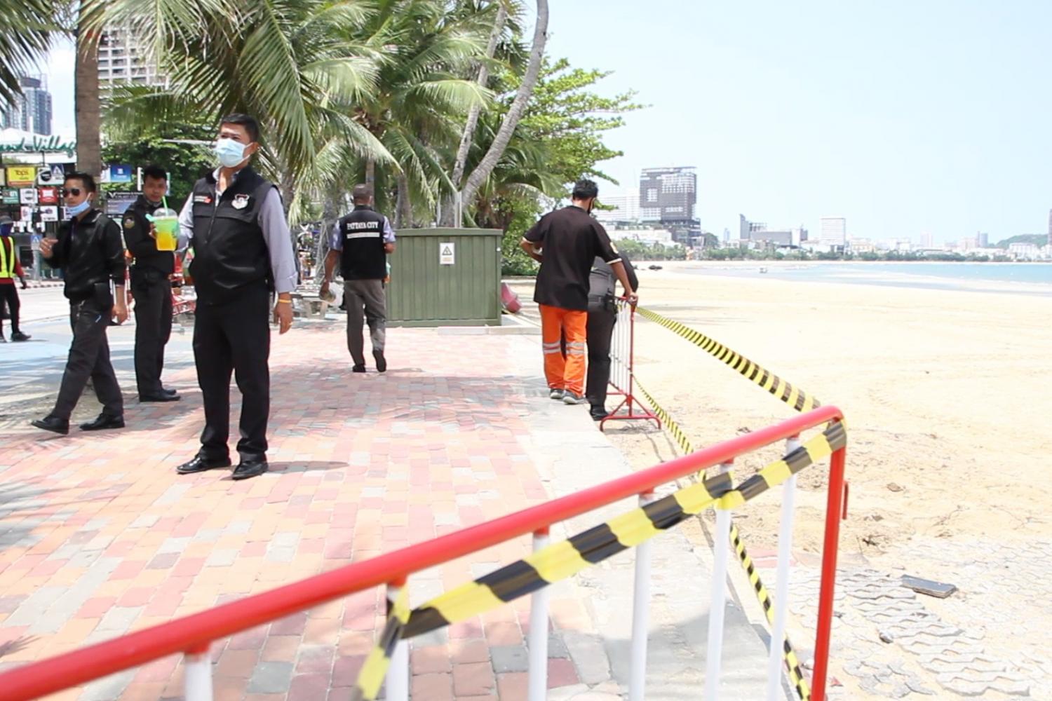 พ.ต.ต.จีรวัฒน์ สุคนธทรัพย์ หัวหน้างานเทศกิจเมืองพัทยา พร้อมกำลังเจ้าหน้าที่นำรั้วเหล็กและเทปทำการกั้นเขตห้ามใช้พื้นที่บนชายหาด ทั้ง 9 จุด ประกอบด้วย หาดพัทยา จอมเทียน หาดพระตำหนัก หาดโคซี่ หาดวงศ์อมาตย์ หาดกระทิงราย สวนสาธารณะลานโพธิ์นาเกลือ และลานท่าเรือบาลีฮาย ทั้งนี้เพื่อเฝ้าระวังประชาชนและนักท่องเที่ยวมานั่งร่วมกุล่มกันก่อให้เกิดการแพร่ระบาดของเชื้อไวรัสโควิด-19 อย่างเข้มงวด