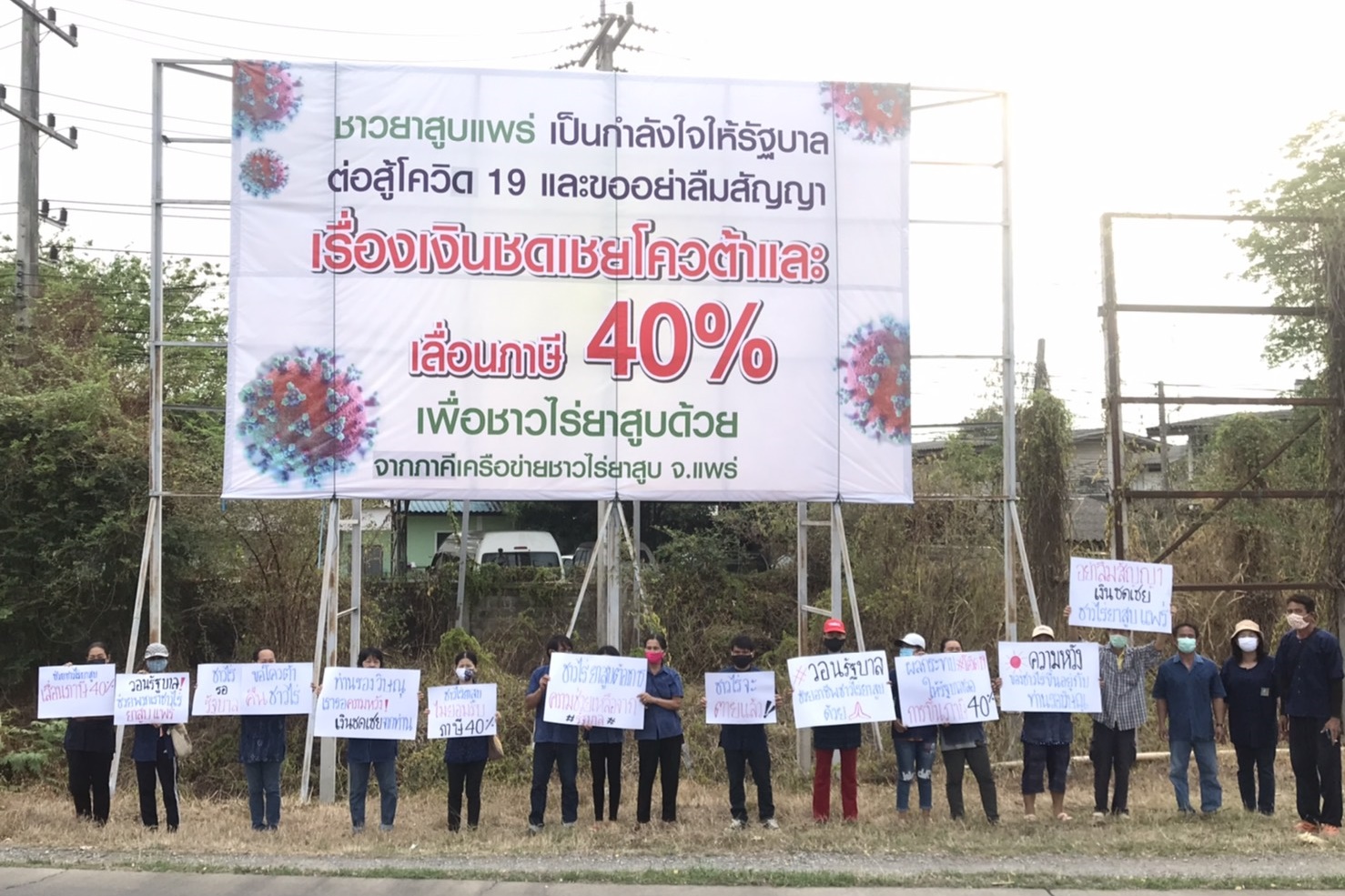 นายล้วน ร่องแก้ว ประธานภาคีเครือข่ายชาวไร่ยาสูบจังหวัดแพร่ นำตัวแทนชาวไร่กว่า 10 คน ร่วมกันติดป้ายคัทเอาท์ขนาดใหญ่ปรากฏข้อความว่า ชาวยาสูบแพร่ เป็นกำลังใจให้รัฐบาลต่อสู้โควิด-19 และขออย่าลืมสัญญาเงินชดเชยโควตาและเลื่อนภาษียาสูบ 40% ด้วย ณ บริเวณสี่แยกร้องเข็ม อ.ร้องกวาง จ.แพร่ พร้อมกล่าวว่า “จังหวัดแพร่มีชาวไร่กว่า 5 พันคน และเป็นจังหวัดที่มีชาวไร่ยาสูบเวอร์ยิเนียร์มากที่สุดในประเทศ ซึ่งส่วนใหญ่ปลูกยาสูบขายให้กับการยาสูบแห่งประเทศไทย (ยสท.) มากันหลายชั่วอายุ การทำยาสูบในภาคเหนือถือเป็นอาชีพหลักที่สร้างรายได้ให้ชาวไร่ยาสูบ เพราะเรามีพื้นที่การเกษตรน้อย การปลูกข้าวหรือปลูกพืชอื่นๆ ก็ทำเพื่อบริโภคเองในครอบครัวเท่านั้น การที่ ยสท. ตัดโควตารับซื้อใบยาครั้งแรกเมื่อสองปีที่แล้ว พวกเราก็ขาดรายได้หลักไปกว่าครึ่งหนึ่ง