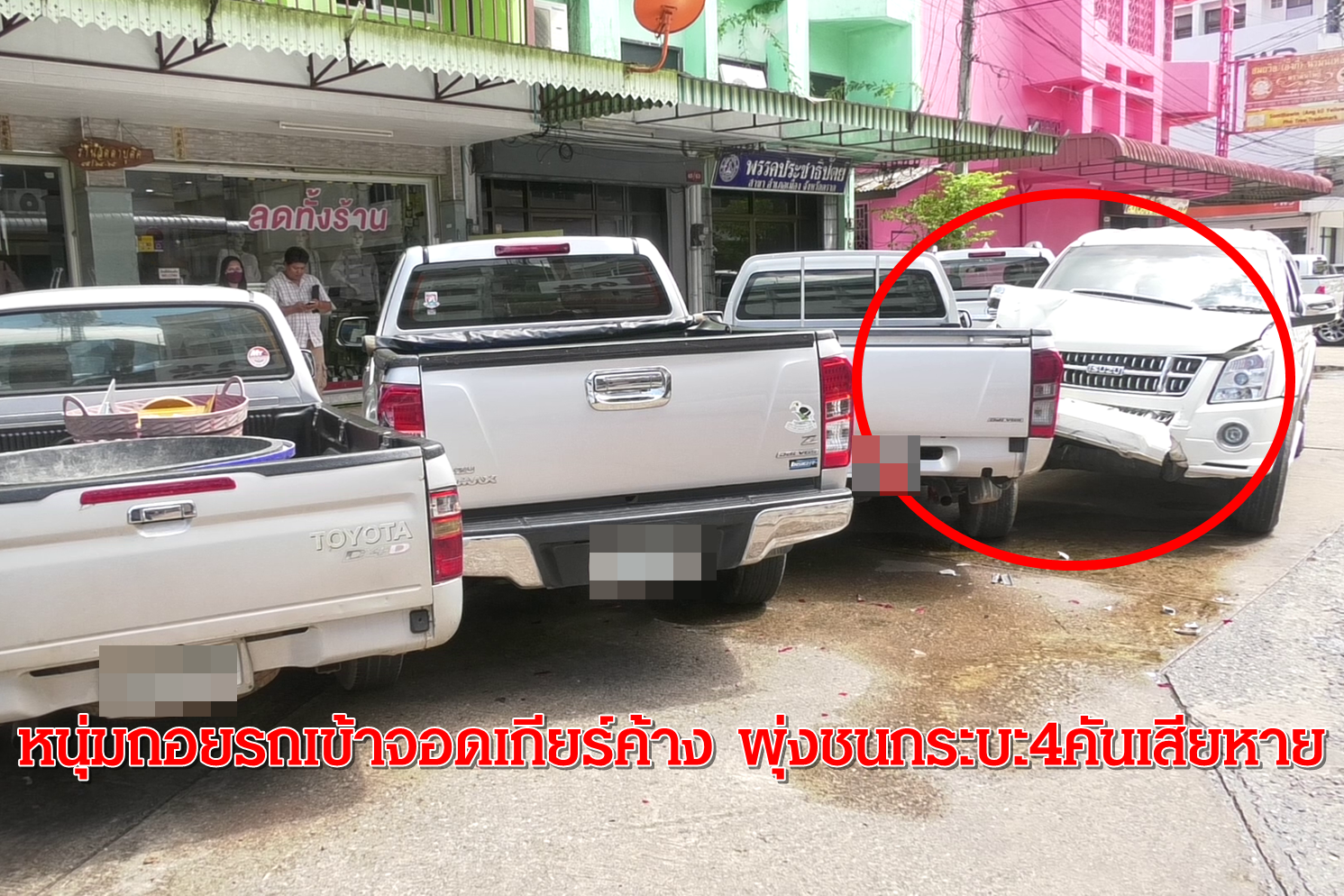 หนุ่มถอยรถเข้าจอดเกียร์ค้าง พุ่งชนกระบะ4คันเสียหาย