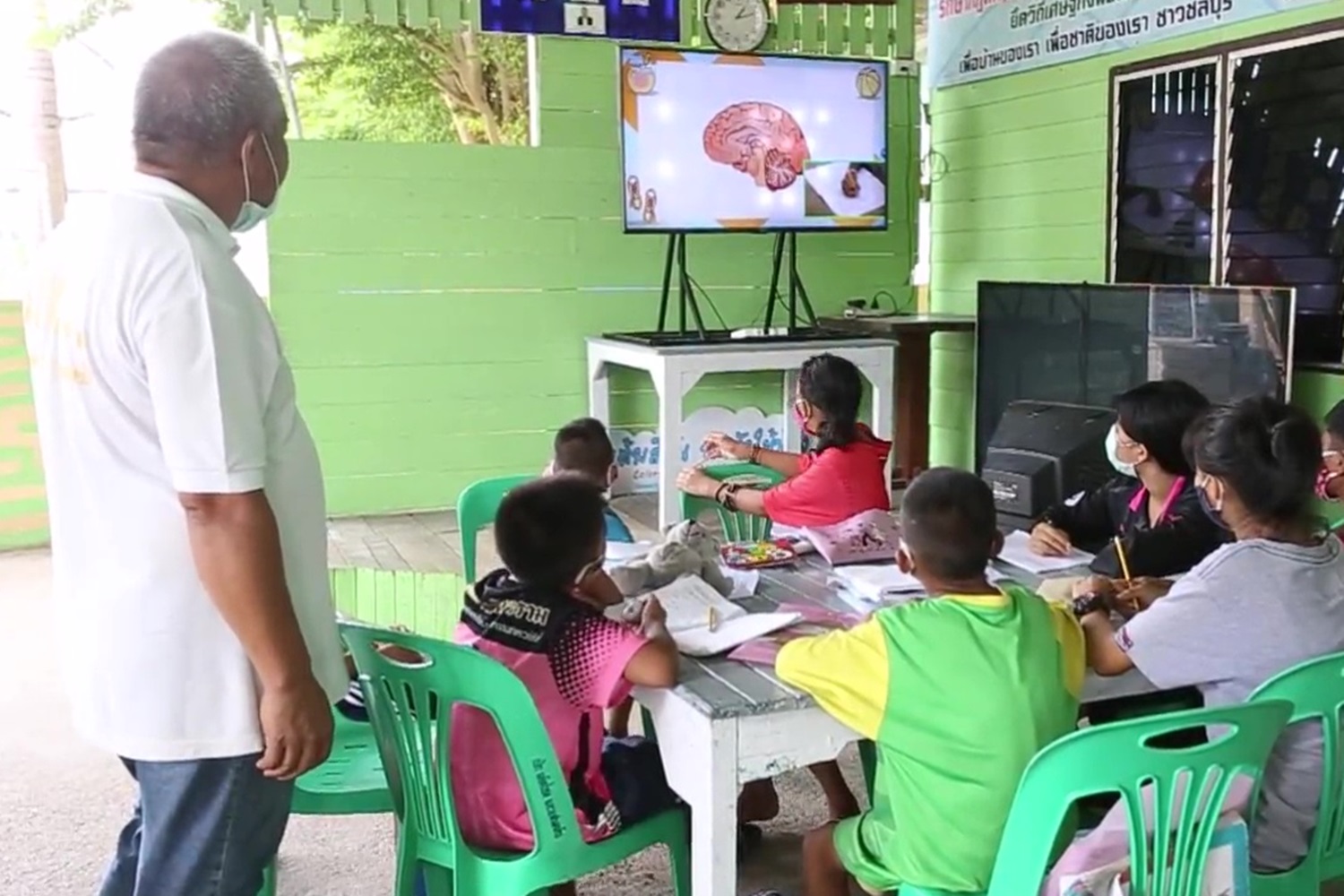 ศูนย์ต่อต้านการค้ามนุษย์และเด็กถูกล่วงละเมิด ตั้งอยู่ที่ ต.หนองปรือ อ.บางละมุง จ.ชลบุรี มีเด็กประมาณ 40 คน แยกระดับเป็นชั้นๆตั้งแต่อนุบาลจนถึงมัธยมศึกษาปีที่ 1 นั่งเรียนหนังสือ โดยมีโทรทัศน์อยู่เพียงเครื่องเดียว ซึ่งนักเรียนแต่ละระดับชั้นก็จะผลัดกันดูการเรียนการสอนคนละ 1 ชั่วโมงไล่ไปตามระดับชั้น แต่นักเรียนชั้นไหนไม่ได้ดูการเรียนการสอนออนไลน์ก็จะมานั่งทำความเข้า ใจกับหนังสือแต่ละชั้น