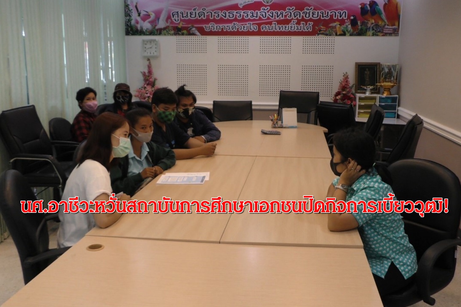 ชัยนาท-นักศึกษาอาชีวะร้องศูนย์ดำรงธรรมจังหวัด สถานศึกษาเอกชนปิดกิจการ หวั่นเบี้ยววุฒิการศึกษาหาที่เรียนใหม่ไม่ได้ สัปดาห์หน้าถ้ายังไม่มีความชัดเจนเตรียมร้องรัฐมนตรีศึกษาช่วยเหลือ
