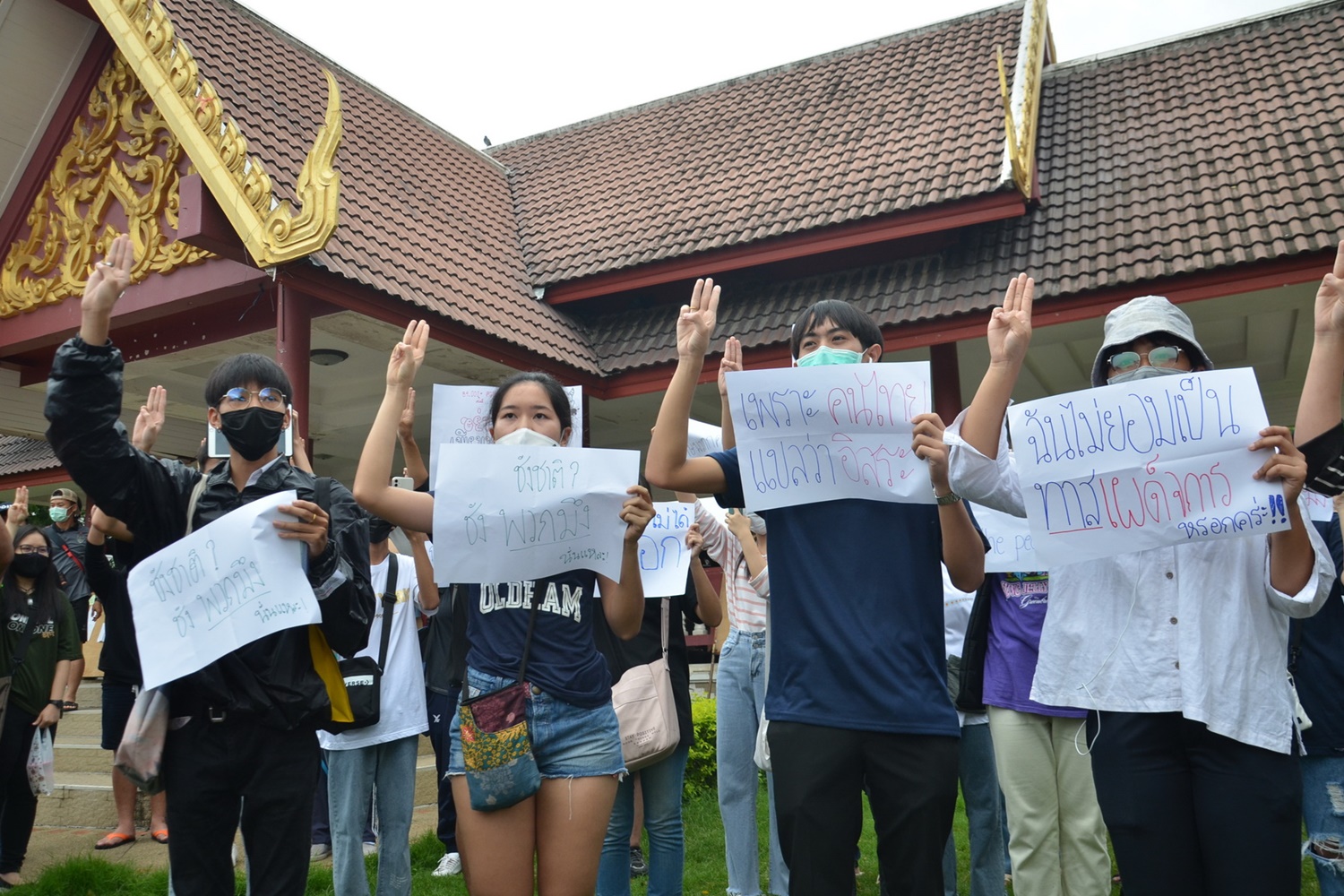 กาญจนบุรี-กลุ่มเยาวชนกาญจน์ปลดแอก จัดชุมนุมขับไล่รัฐบาลพร้อมชู 3 นิ้วยื่นร้องเพลงชาติ ยื่น 3 ข้อ ยุบสภา-เลือกตั้งเป็นธรรม-หยุดการอุ้มหาย