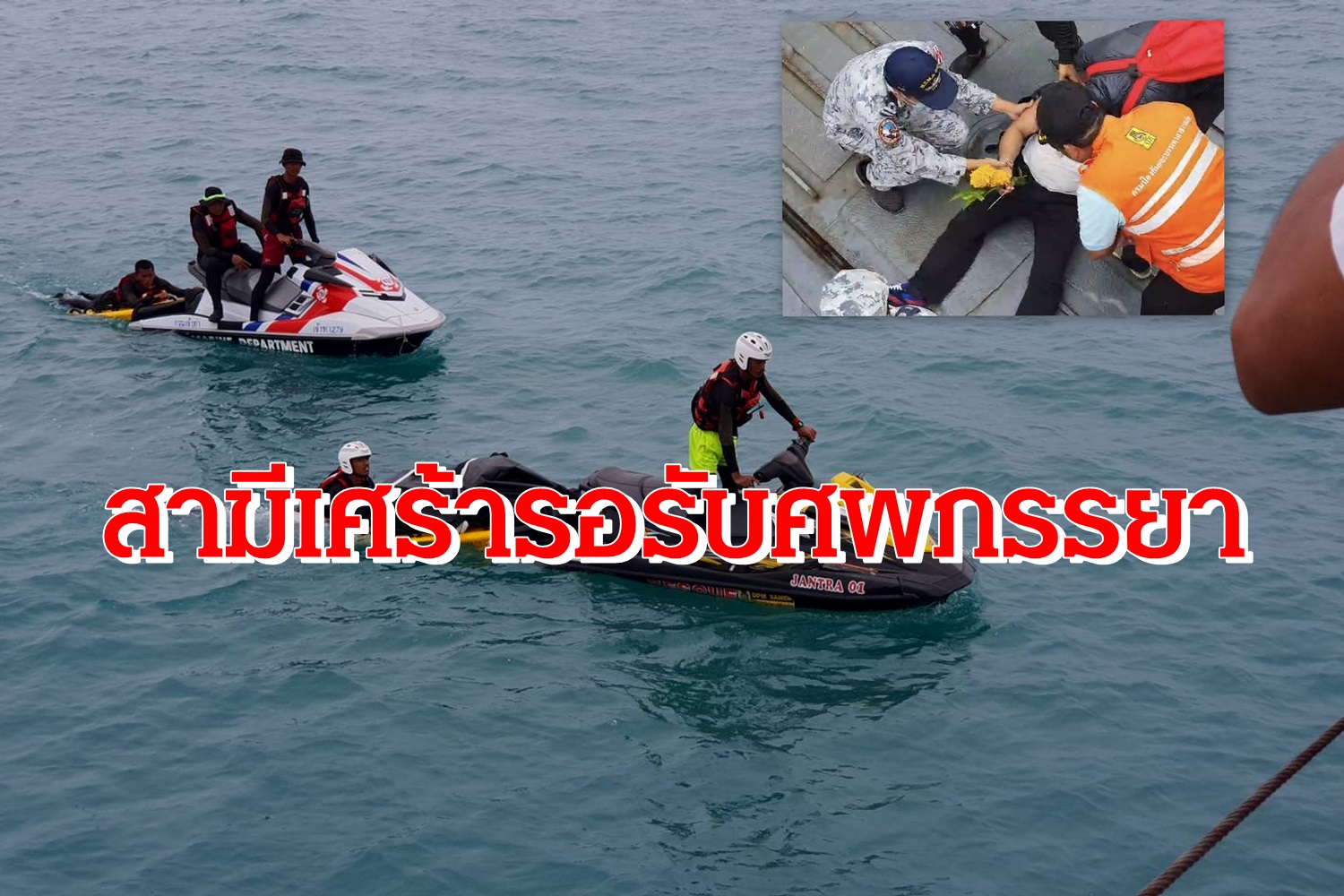 ทันทีที่นำศพขึ้นเรือหลวง ต.237 ทัพเรือภาคที่ 2 นายปัญญา สุกชนะสงคราม อายุ 43 ปี สามีผู้เสียชีวิตร่ำไห้เสียใจจนทรุดกองกับพื้น เจ้าหน้าที่เข้าช่วยปฐมพยาบาลและนำผ้าแดงผ้าขาว พร้อมดอกไม้จุดธูปเทียน ทำพิธีขอแม่ย่านางบนเรือหลวง ต.237 ให้นำศพกลับเข้ามายังฝั่งนำส่งชันสูตรที่โรงพยาบาลเกาะสมุย