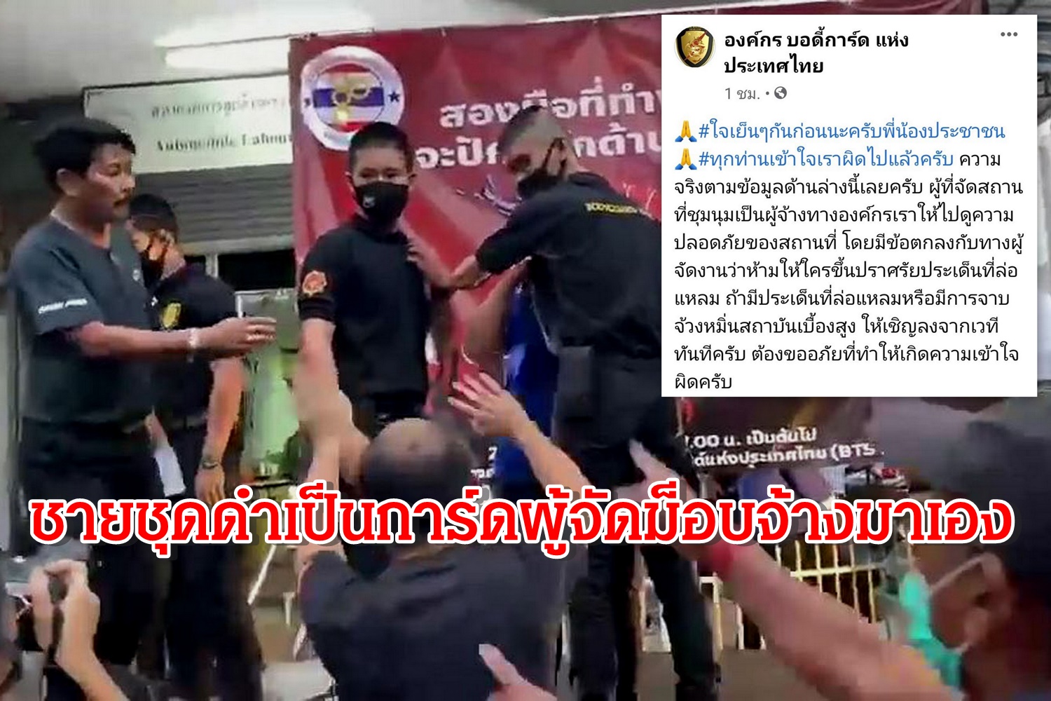 ล่าสุดเพจ องค์กร บอดี้การ์ด แห่งประเทศไทย ได้ออกมาโพสต์ข้อความชี้แจงเรื่องที่ที่เกิดขึ้นว่า "ใจเย็น ๆ กันก่อนนะครับพี่น้องประชาชนทุกท่านเข้าใจเราผิดแล้วครับ ความจริงตามข้อมูลด้านล่างนี้เลยครับ ผู้ที่จัดสถานที่ชุมนุมเป็นผู้จ้างทางองค์กรเราให้ไปดูความปลอดภัยของสถานที่ โดยมีข้อตกลงกับทางผู้จัดงานว่าห้ามให้ใครขึ้นปราศรัยประเด็นที่ล่อแหลม ถ้ามีประเด็นที่ล่อแหลมหรือจาบจ้วงหมิ่นสถาบันเบื้องสูง ให้เชิญลงเวทีทันทีครับ ต้องขออภัยที่ทำให้เกิดความเข้าใจผิดครับ"