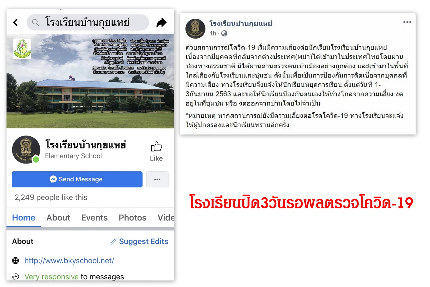 โรงเรียนบ้านกุยแหย่ ต.ลิ่นถิ่น อ.ทองผาภูมิ จ.กาญจนบุรี แจ้งผ่านเฟซบุ๊กว่า โรงเรียนได้ปิดเรียนชั่วคราว 3วัน ด้วยสถานการณ์โควิด-19 เริ่มมีความเสี่ยงกับนักเรียนในโรงเรียนแห่งนี้เนื่องจากมีบุคคลจากเมียนมาลอบเข้ามาในไทยผ่านเส้นทางธรรมชาติมิได้ผ่านด่านตรวจคนเข้าเมือง ข้ามาในพื้นที่ใกล้เคียงกับโรงเรียนและชุมชน ดังนั้นเพื่อเป็นการป้องกันการติดเชื้อจากบุคคลที่มีความเสี่ยง โรงเรียนจึงแจ้งให้นักเรียนหยุดการเรียน ตั้งแต่วันที่ 1- 3ก.ย.63 และขอให้นักเรียนป้องกันตนเองให้ห่างไกลจากความเสี่ยง งดอยู่ในที่ชุมชน หรือ งดออกจากบ้านโดยไม่จำเป็น หากสถานการณ์ยังมีความเสี่ยงต่อโรคโควิด-19 ทางโรงเรียนจะแจ้งให้ผู้ปกครองและนักเรียนทราบอีกครั้ง