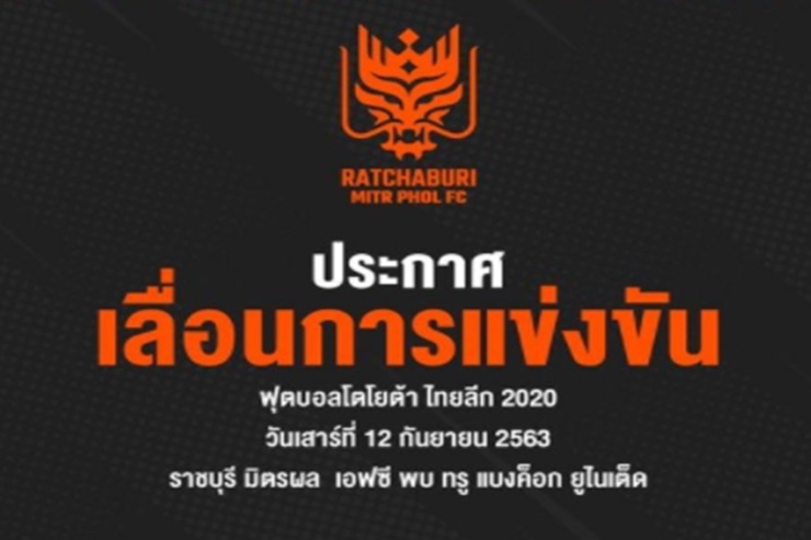 ล่าสุด ทางสโมสรราชบุรีมิตรผล เอฟซี ได้ออกประกาศผ่านเฟซบุ๊ก ของทางสโมสร ว่าจะทำการเลื่อนการแข่งขัน ฟุตบอลโตโยต้า ไทยลีก 2020 วันเสาร์ที่ 12 ก.ย. 63 ราชบุรี มิตรผล เอฟซี พบ ทรู แบงค็อก ยูไนเต็ด ออกไปและจะประกาศโปรแกรมการแข่งขันนัดนี้ให้ทราบอีกครั้งหลังจากได้บทสรุปจากไทยลีก
