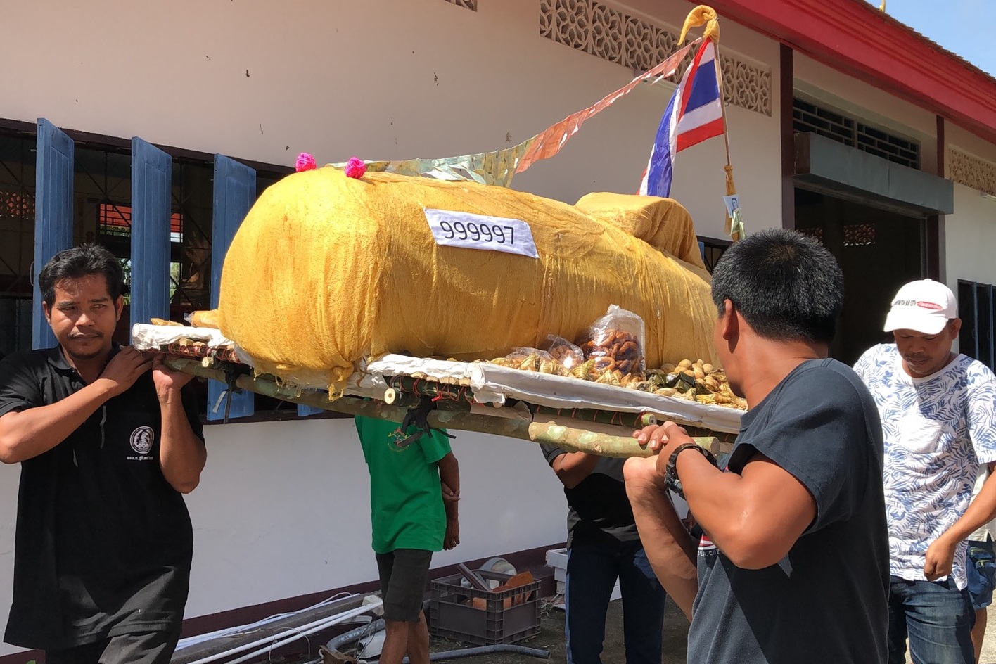 สงขลา-ชาวบ้านแห่หมรับสร้างเป็นเรือดำน้ำติดเลข 999997 รางวัลที่1งวด1ก.ย.63 ในพิธีสารทเดือนสิบแห่ไปวัด วันส่งตายาย