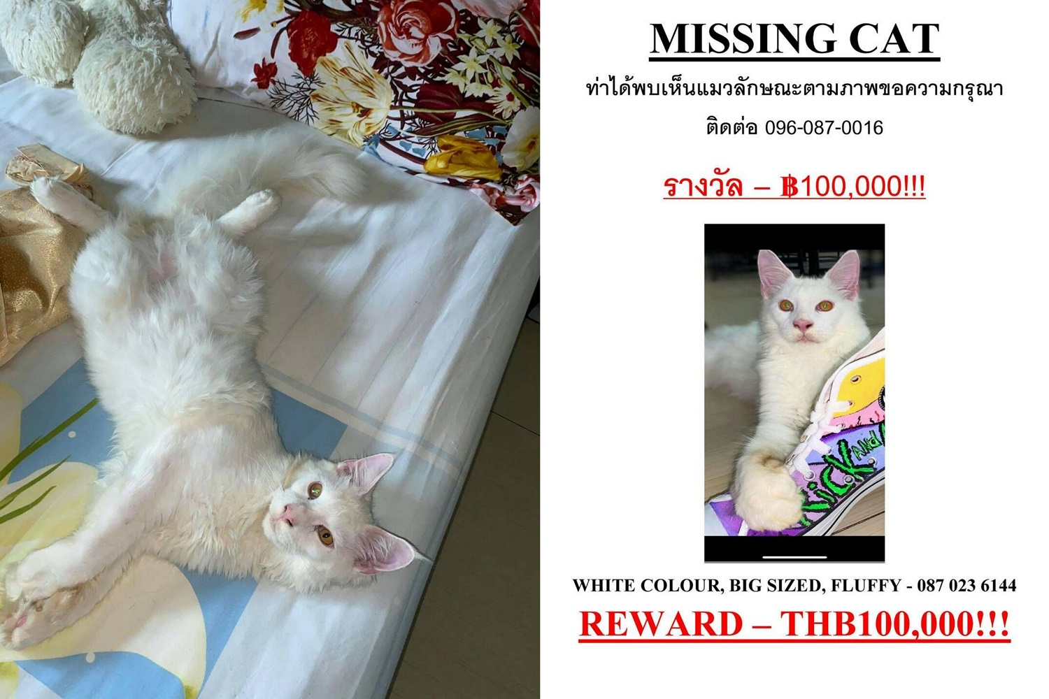 Mrs.Oksana Kobzar เล่าผ่านล่ามแปลภาษาว่า แมวตัวที่หายซื้อให้วันเกิดลูกสาว และเลี้ยงมาตั้งแต่เล็กๆจนปัจจุบัน 9 เดือน ซึ่งแมวตัวดังกล่าวเป็นที่รักของครอบครัว มีขนาดลำตัวใหญ่ ฉลาด หางเป็นพวงใหญ่สวย เป็นแมวสายพันธุ์ที่มีราคาสูง ซึ่งหายออกจากบ้านไปได้ประมาณ 1 สัปดาห์แล้ว พยายามหาแต่ไม่พบ จึงตัดสินใจลงประกาศตามหา หวังจะได้คืน ซึ่งหากใครพบเห็น และนำมาส่งคืนจะมีรางวัลให้ 100,000 บาท โดยสามารถติดต่อส่งคืนได้ที่เบอร์โทร 0960870016.