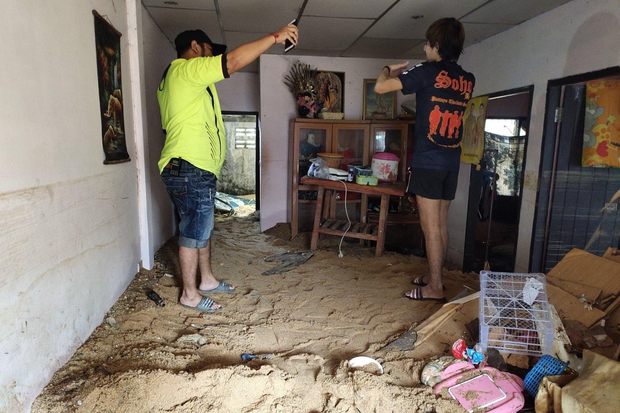 ที่บ้านเลขที่ 80/99 80/100 และตลอดแนวบ้านใกล้เคียง กำแพงด้านหลังตัวบ้านพังถล่มจากแรงดันของน้ำและทราย ทำให้กระแสนำพัดทรายเข้ามาในตัวบ้านสูงกว่า 30 เซนติเมตร เจ้าหน้าที่สิงแวดล้อมเมืองพัทยา ร่วมกับชาวบ้านต้องช่วยกันลำเลียงทรายออกจากตัวบ้าน และเก็บกู้ทรัพย์สินที่ถูกทรายกลบทั้งหมดออกมา บ้างห้องยังพบว่ามีน้ำท่วมขังอยู่ ชาวบ้านก็ช่วยกันวิดน้ำออก เพื่อที่จะเข้าพักอาศัยต่อ