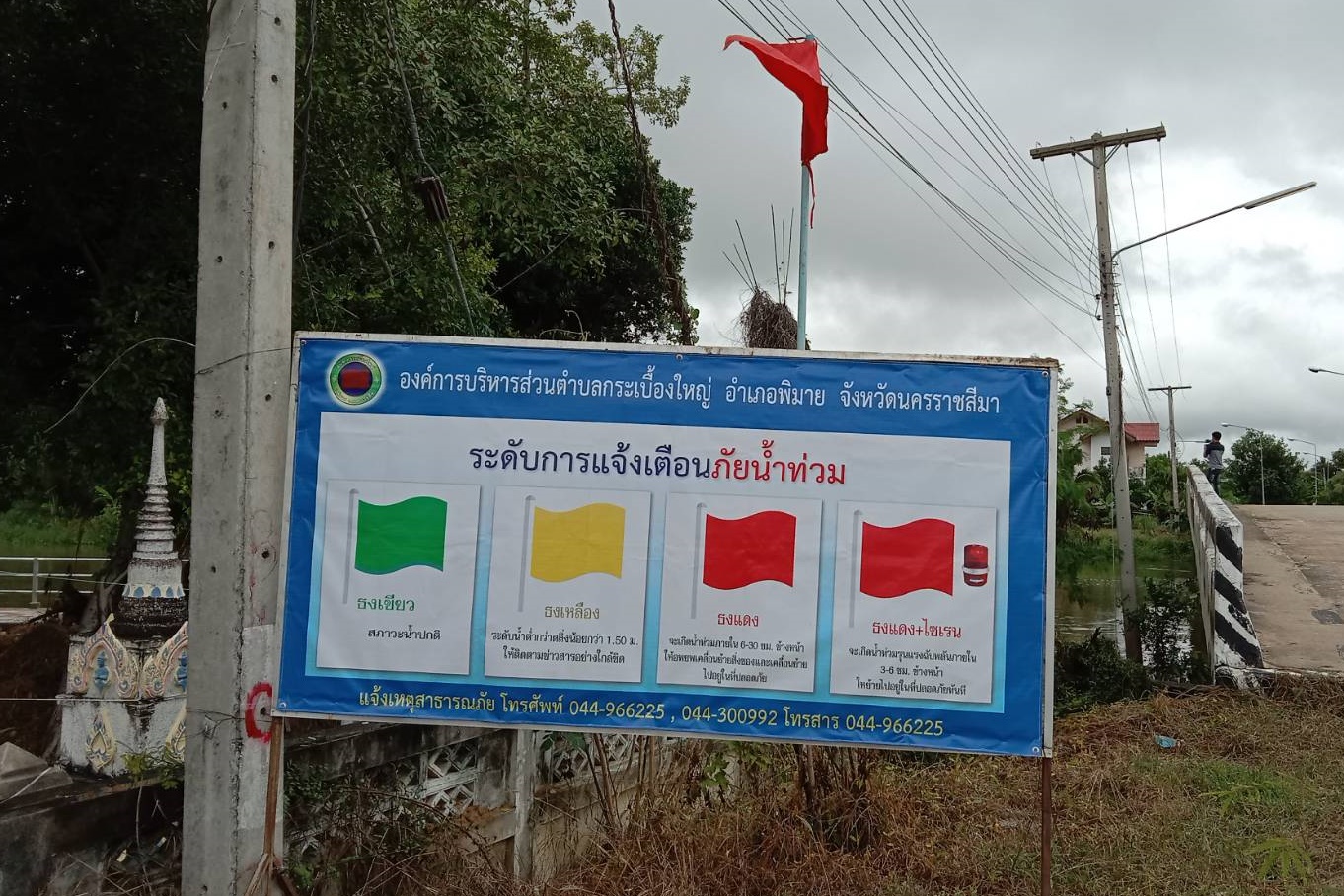 ล่าสุด องค์การบริหารส่วนตำบลกระเบื้องใหญ่ ได้ปักธงสีแดง แจ้งเตือนให้ประชาชนที่มีบ้านเรือนอยู่ติดกับลำน้ำมูล เตรียมอพยพขนย้ายสิ่งของขึ้นสู่ที่สูง เนื่องจากปริมาณน้ำเพิ่มสูงในรอบ 10 ปี ใกล้เคียงกับมหาอุทกภัยในปี 2553 ซึ่งอำเภอพิมายเคยเกิดน้ำท่วมหนักมาแล้ว ขอให้ประชาชนติดตามประกาศแจ้งเตือนจากทางราชการอย่างใกล้ชิด โดยทางอำเภอพิมายจะแจ้งข่าวสารให้กับกำนันผู้ใหญ่บ้านทุกหมู่บ้าน ได้ทราบถึงสถานการณ์น้ำทุกวัน