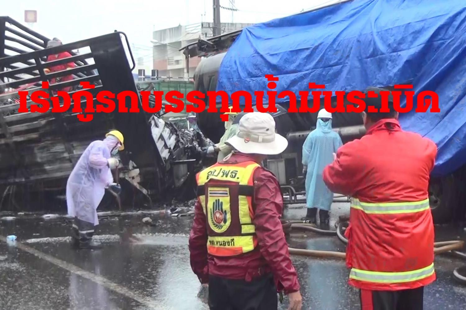 บุรีรัมย์-ประมวลภาพเจ้าหน้าที่กู้เหตุบรรทุกน้ำมันระเบิดหลังชนพ่วง18ล้อ ผ่านมามากว่า8ชม.แล้ว ยังเคลื่อนย้ายรถทั้ง2คันออกจากถนนไม่ได้ รอสูบน้ำมันที่เหลือราว30,000ลิตร