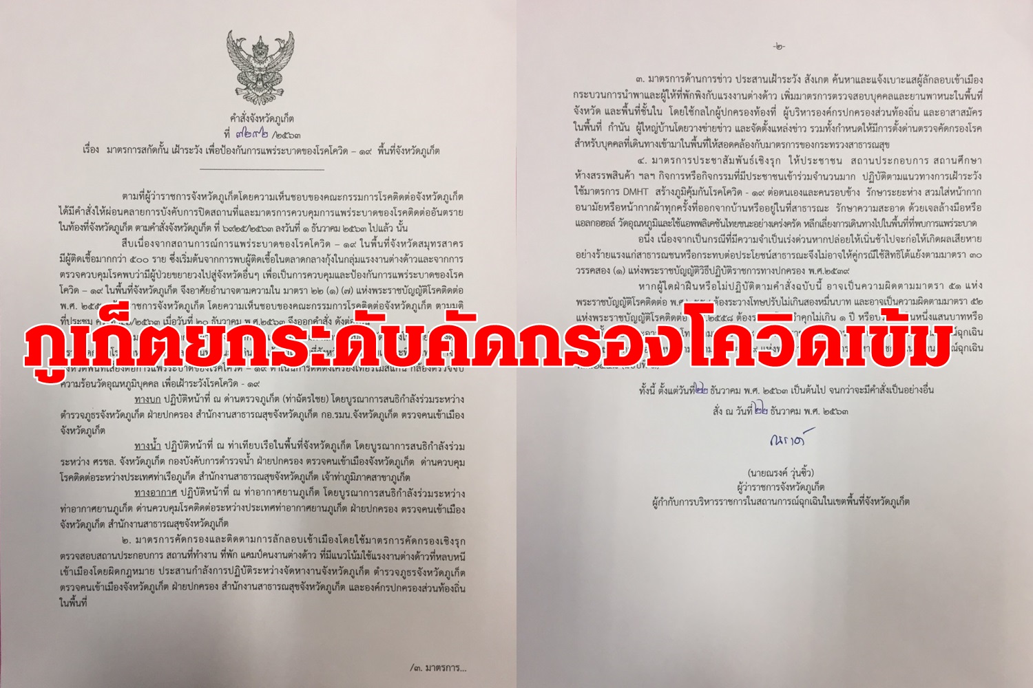 เมื่อวันที่ 22 ธ.ค.63 นายณรงค์ วุ่นซิ้ว ผู้ว่าราชการจังหวัดภูเก็ต กล่าวว่า หลังเกิดสถานการณ์แพร่ระบาดโรคโควิด-19ที่จ.สมุทรสาคร ในส่วนของจังหวัดภูเก็ต ได้เพิ่มมาตรการเฝ้าระวังยกระดับการตรวจคัดกรองโรคโควิด-19 ทั้ง ทางบก ทางน้ำ ทางอากาศ และกำชับให้ตรวจคัดกรองเชิงรุกในกลุ่มแรงงานต่างด้าวในพื้นที่ เพื่อเฝ้าระวังป้องกันโรคโควิด-19 โดยออกคำสั่งจังหวัดภูเก็ตที่ 7292/2563 เรื่อง มาตรการสกัดกั้น เฝ้าระวังเพื่อป้องกันการแพร่ระบาดของโรคโควิด-19พื้นที่ดังต่อไปนี้