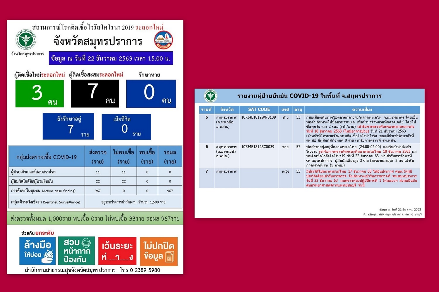 เมื่อวันที่ 22 ธันวาคม 2563 เวลา 15.00 น. สาธารณสุขจังหวัดสมุทรปราการ รายงานผู้ป่วยยืนยัน COVID-19 พบผู้ติดเชื้อระลอกใหม่ 3 คน รวมยอดสะสม 7 ราย