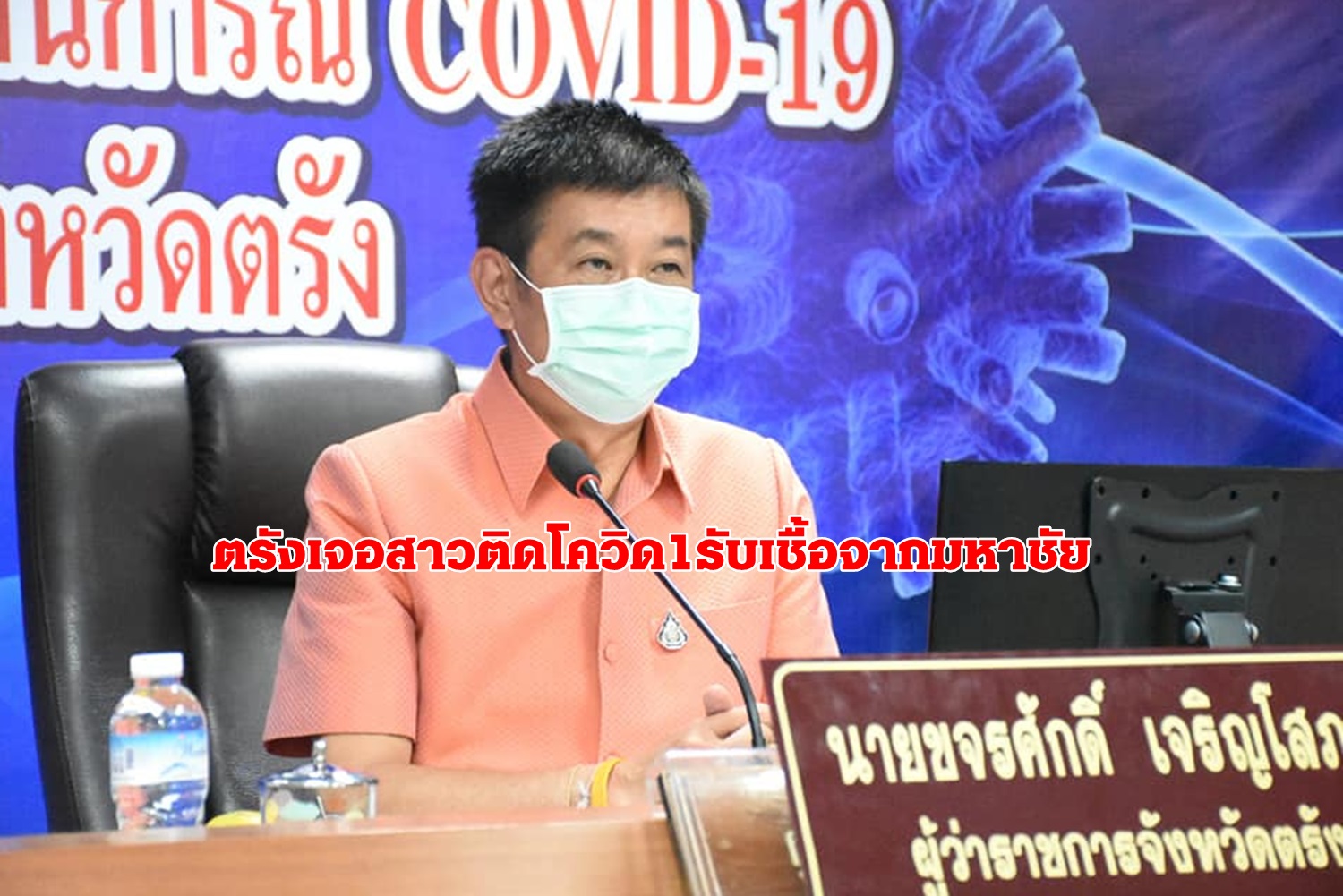 เมื่อวันที่ 25 ธ.ค.63 เวลา 16.00น. ที่ศูนย์แถลงข่าวจังหวัดตรัง นายขจรศักดิ์ เจริญโสภา ผู้ว่าราชการจังหวัดตรัง นพ.บรรเจิด สุขพิพัฒปานนท์ นายแพทย์สาธารณสุขจังหวัด ตรัง นายสมบัติ สธนเสาวภาคย์ ผู้อำนวยการโรงพยาบาลตรัง พล.ต.ต.สันทัด วินสน ผบก.ภ.จว.ตรัง และนายไกรสร โตทับเที่ยง หัวหน้ากลุ่มงานเวชกรรม สังคม โรงพยาบาลตรัง ร่วมแถลงข่าว กรณีจังหวัดตรังพบผู้ติดเชื้อไวรัสโคโรนา 19 (COVID-19) จำนวน 1 ราย