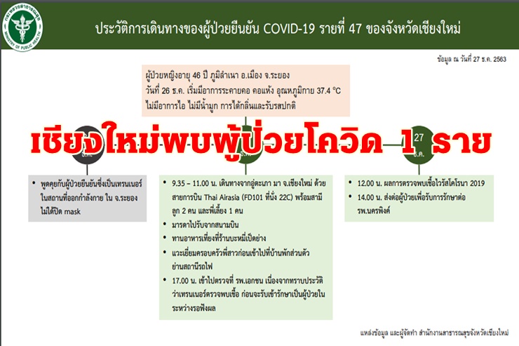 นายแพทย์กิตติพันธุ์ ฉลอม ผู้ช่วยนายแพทย์สาธารณสุขจังหวัดเชียงใหม่ กล่าวว่า จากที่ทุกท่านได้ติดตามข่าวสารการระบาดของโควิด 19 ใน จ.สมุทรสาคร ในช่วงที่ผ่านมา และคณะกรรมการโรคติดต่อจังหวัดเชียงใหม่ได้เพิ่มมาตรการเฝ้าระวังเข้มข้นนั้น พบว่าได้ตรวจผู้ที่มีประวัติเสี่ยง เดินทางมาจากจังหวัด สมุทรสาครในช่วงสัปดาห์ที่ผ่านมา (21-26 ธ.ค.) ไปแล้วกว่า 144 คน ผลตรวจหาเชื้อเป็นลบทั้งหมด แต่จากข้อมูลที่ ศบค. แถลงในช่วง 1-2 วันที่ผ่านมา พบว่ามีการระบาดเพิ่มเติม โดยเฉพาะในพื้นที่ จ.ระยอง ทำให้เราต้องเฝ้าระวังกลุ่มผู้ที่มีประวัติเสี่ยงเพิ่มเติมมากขึ้น จนกระทั่งวันนี้ ทาง สสจ.เชียงใหม่ ได้รับรายงานว่าพบผู้ติดเชื้อที่มีประวัติสัมผัสกับผู้ป่วยจาก จ.ระยอง ได้เดินทางมาใน จ.เชียงใหม่ และตรวจพบเชื้อ เป็นหญิงไทย อายุ 46 ปี ภูมิลำเนาอำเภอเมือง จังหวัดระยอง เดินทางเข้ามาในจังหวัดเชียงใหม่ เมื่อช่วงเช้าของวันที่ 26 ธ.ค. 2563 มีอาการระคายคอ คอแห้ง อุณหภูมิ 37.4 องศา ไม่มีอาการไอ ไม่มีน้ำมูก การได้กลิ่นและรับรสปกติ ประกอบกับได้รับข่าวจากผู้ที่เคยใกล้ชิด พบผลการตรวจติดเชื้อไวรัสโคโรนา 2019 จึงได้เดินทางเข้าไปตรวจที่รพ.เอกชน ในจังหวัดเชียงใหม่ พร้อมแจ้งประวัติการเดินทางจากพื้นที่เสี่ยง และสัมผัสกับผู้ป่วยโควิด-19 ที่จังหวัดระยอง ผลตรวจยืนยันพบเชื้อไวรัสโคโรนา 2019 (วันที่ 27 ธ.ค. 2563) ขณะนี้รับรักษาตัวที่ห้องแยกความดันลบ โรงพยาบาลนครพิงค์ จังหวัดเชียงใหม่ ซึ่งถือเป็นผู้ป่วยโควิด-19 รายที่ 47 ของจังหวัดเชียงใหม่ แต่เป็นเพียงการนำเชื้อเข้ามาจากภายนอกจังหวัด ยังไมท่พบการระบาดในจังหวัดเชียงใหม่แต่อย่างใด