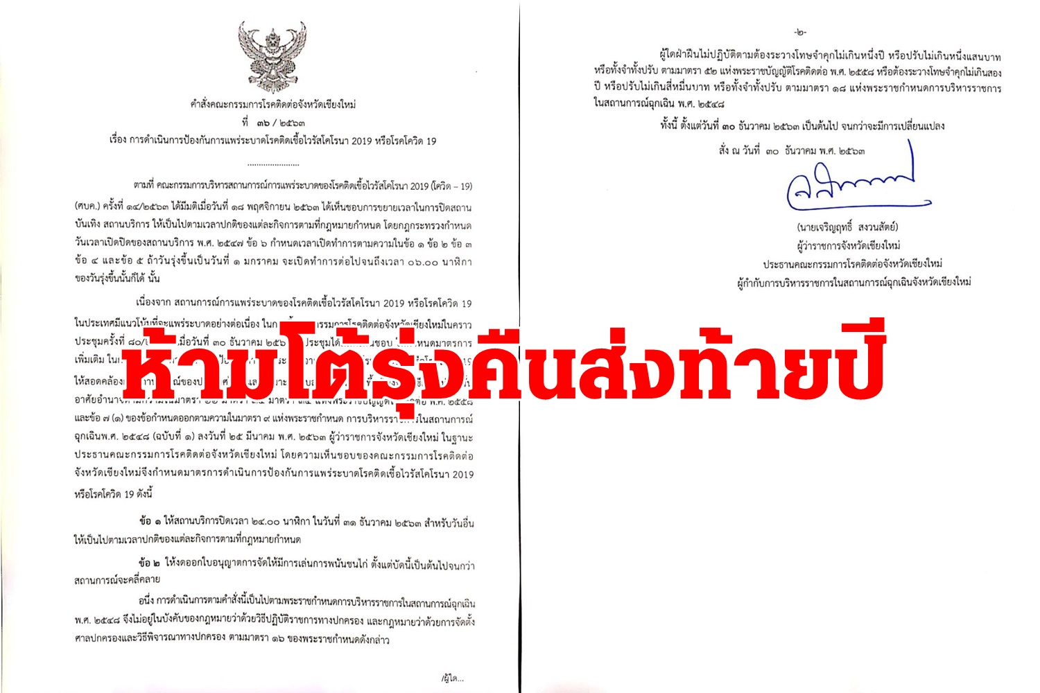 เชียงใหม่-ผู้ว่าฯเชียงใหม่ยกการ์ดสูง สั่งปิดบ่อนไก่ ห้ามสถานบันเทิง ร้านอาหารเปิดโต้รุ่งคืนวันส่งท้ายปีเก่าต้อนรับปีใหม่ ฝ่าฝืนเจอโทษทั้งจำและปรับ