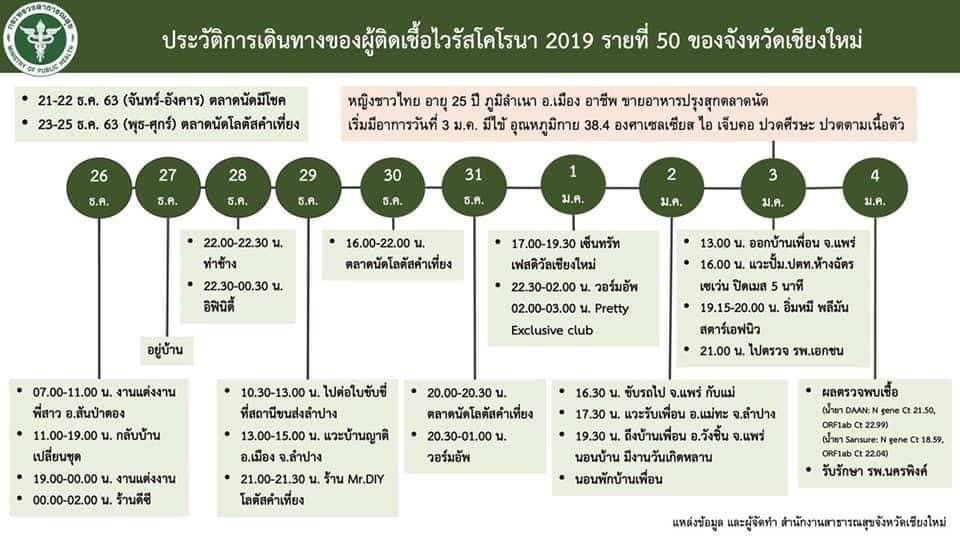 เมื่อวันที่ 4 ม.ค. 64 นายเจริญฤทธิ์ สงวนสัตย์ ผู้ว่าราชการจังหวัดเชียงใหม่ พร้อมด้วย นายแพทย์สาธารณสุขจังหวัดเชียงใหม่และเจ้าหน้าที่เกี่ยวข้องชี้แจงข้อมูลการพบผู้ป่วยติดเชื้อโควิด-19รายล่าสุด ซึ่งเป็นรายที่ 50 ในพื้นที่จังหวัดเชียงใหม่ โดยผู้ป่วยเป็นเพศหญิง อายุ 25 ปี และมีประวัติ Time line เดินทางไปตามสถานบันเทิงและร้านต่างๆหลายแห่งในพื้นที่จังหวัดเชียงใหม่และจังหวัดอื่น ๆ โดยเฉพาะคืนส่งท้ายปีเก่ามีประวัติไปสถานบันเทิงดัง 5 แห่ง ซึ่งมีความเสี่ยงที่อาจมีผลกระทบในวงกว้างต่อประชาชนโดยทั่วไป
