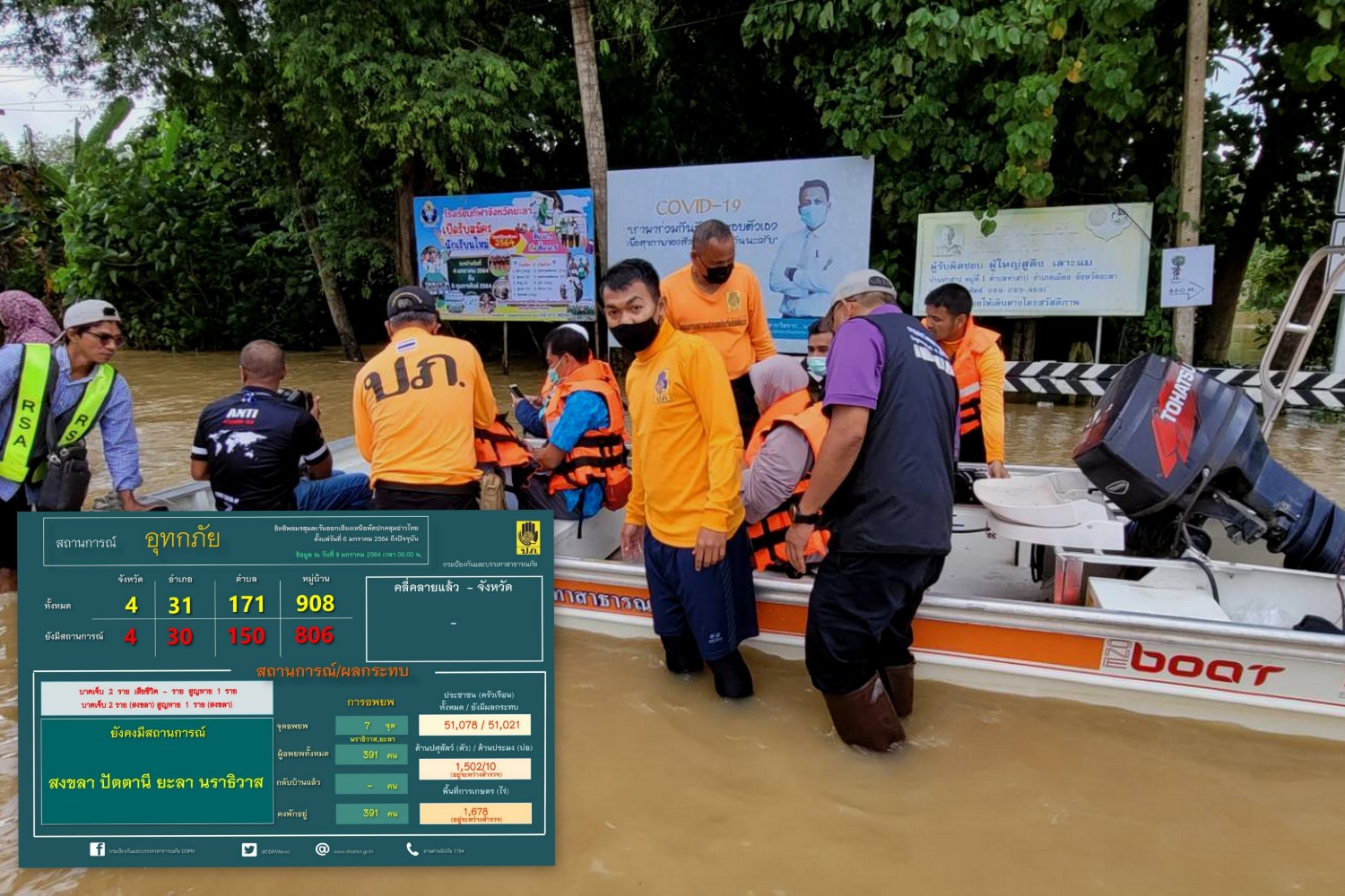 4จังหวัดภาคใต้ สงขลา ยะลา นราธิวาส ปัตตานี อ่วมอุทกภัย 31 อำเภอ 171ตำบล 908หมู่บ้าน เดือดร้อน 51,078 ครัวเรือนได้รับผลกระทบ