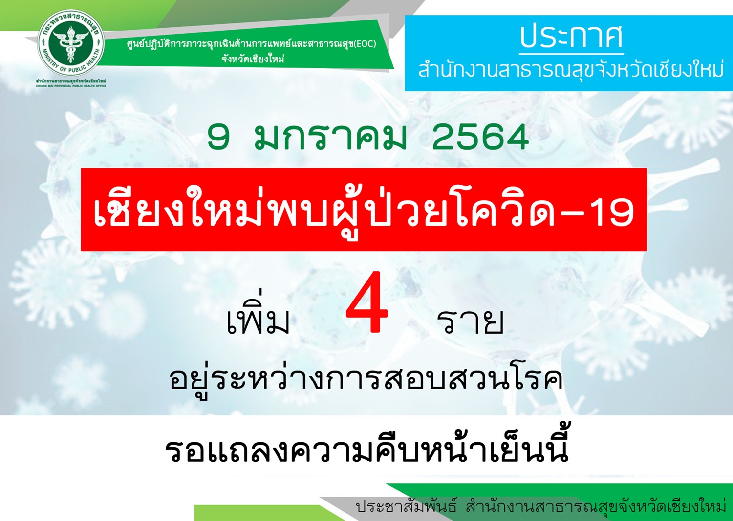 นายวีระพันธ์ ดีอ่อน รองผู้ว่าราชการจังหวัดเชียงใหม่กล่าวว่า การพบผู้ป่วยติดเชื้อเพิ่ม 4 รายล่าสุดนี้เป็นผลสืบเนื่องจากมาตรการตรวจเชิงรุกกับกลุ่มสัมผัสเสี่ยงผู้ติดเชื้อที่พบในสถานบันเทิง ที่ไปฉลองสิ้นปีในคืนวันที่ 31 ธ.ค. ขณะนี้อยู่ในการรักษาของแพทย์และรายอื่นๆ ก่อนหน้าอาการปกติยังไม่พบรายใดเข้าข่ายวิกฤต โดยเจ้าหน้าที่กำลังเร่งสอบสวนไทม์ไลน์ผู้ป่วยทั้ง 4 รายล่าสุดนี้