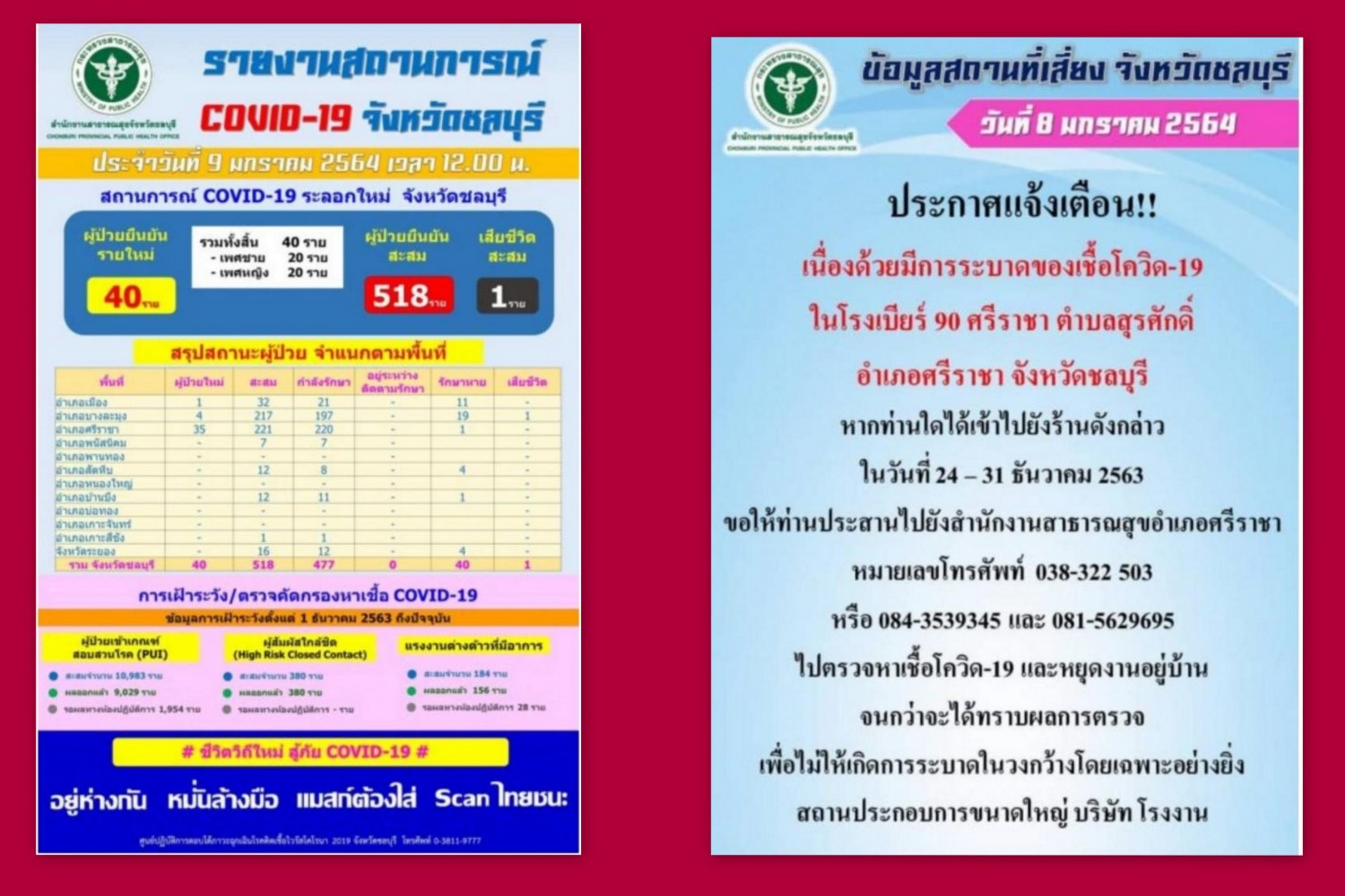 นพ.วิชัย ธนาโสภณ รองนายแพทย์สาธารณสุขจังหวัดชลบุรี เปิดเผยว่า เนื่องจากมีผู้ติดเชื้อโควิด-19 ให้ประวัติว่าทำงานที่จังหวัดระยองและได้เดินทางเข้าไปยังโรงเบียร์ 90 ศรีราชา ตำบลสุรศักดิ์ อำเภอศรีราชา จังหวัดชลบุรี ทางทีมสอบสวนโรคได้ค้นหาเชิงรุก ขณะนี้พบผู้ติดเชื้อโควิด-19 จำนวน 23 ราย และกำลังค้นหาเพิ่มเติมเพื่อไม่ให้เกิดการระบาดในวงกว้าง