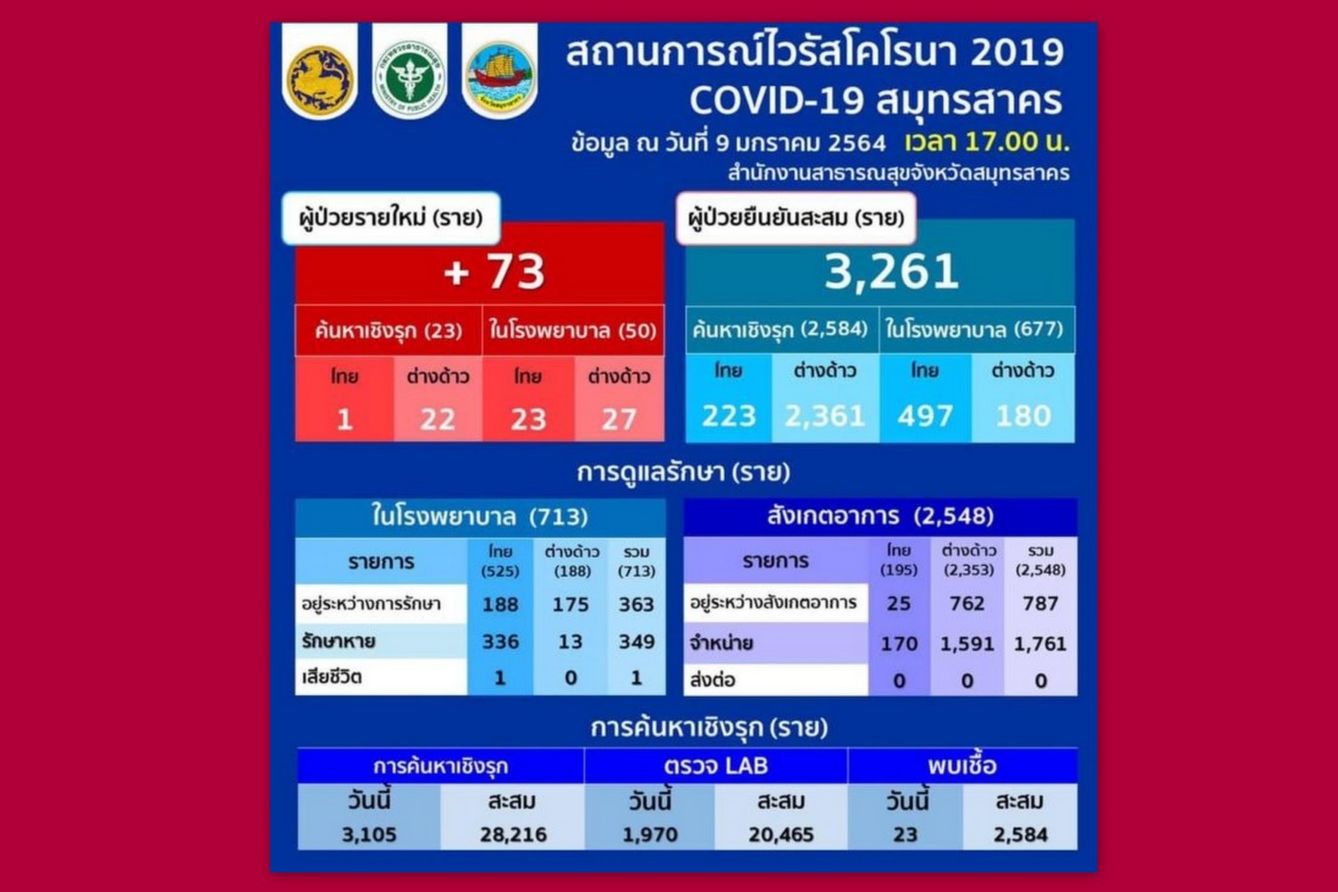 เมื่อวันที่ 9ม.ค.64 สสจ.สมุทรสาคร รายงานสถานการณ์การระบาดของเชื้อไวรัสโคโรนา 2019 ( COVID 19) มีผู้ป่วยรายใหม่ 73 ราย ซึ่งพบจากการตรวจค้นหาเชิงรุกรวม 23 ราย เป็นคนไทย 1 ราย และคนต่างด้าว 22 ราย ที่เหลือพบจากการตรวจหาเชื้อในโรงพยาบาลจำนวน 50 ราย จำแนกเป็นคนไทย 23 ราย และ ต่างด้าว 27 ราย สำหรับผู้ป่วยยืนยันสะสมทั้งหมดมีจำนวน 3,261 ราย เป็นคนไทย (ทั้งในโรงพยาบาลและการค้นหาเชิงรุก) รวม 720 ราย และคนต่างด้าว (ทั้งในโรงพยาบาลและการค้นหาเชิงรุก) รวม 2,541 ราย