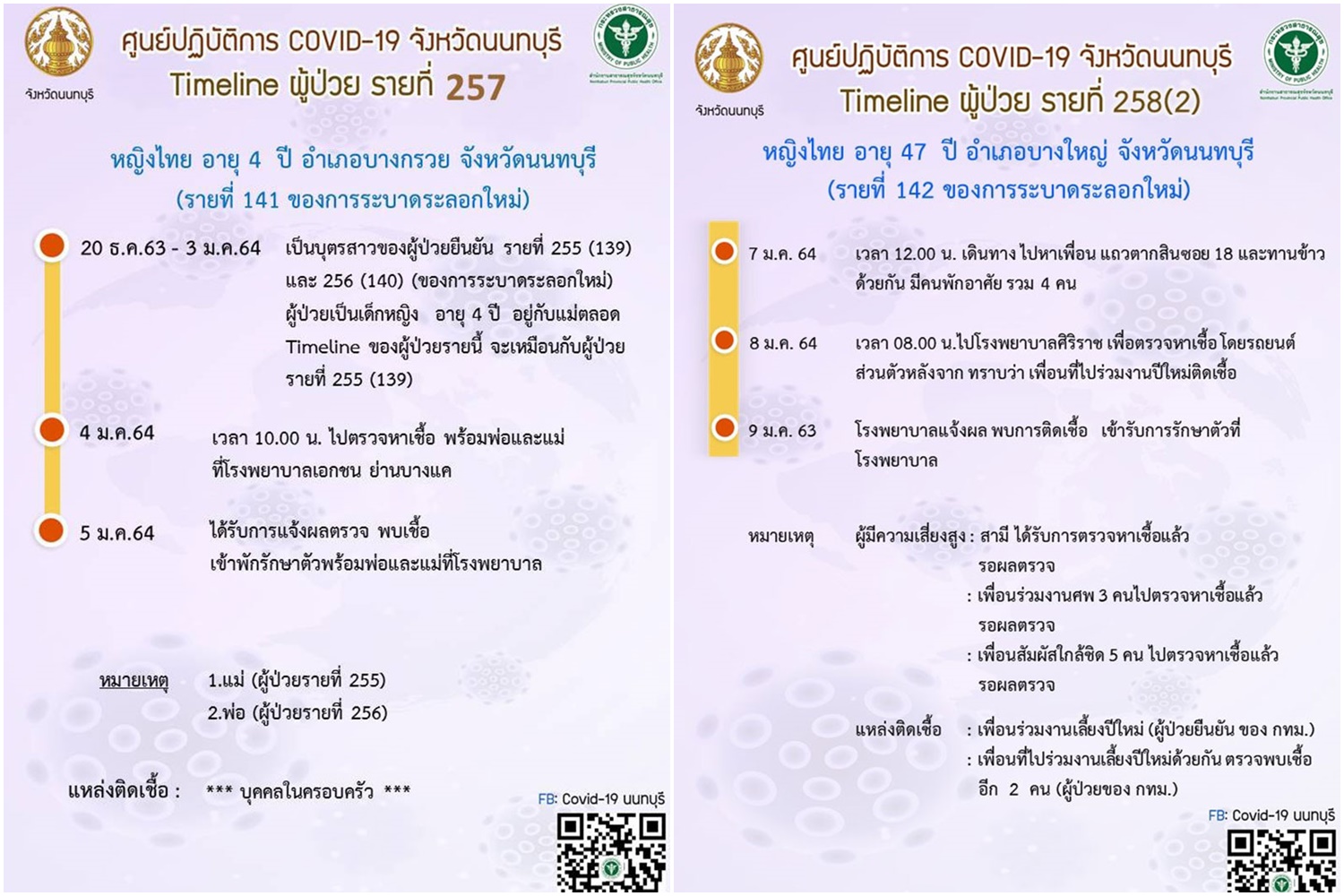 ทั้งนี้ มีการแจ้งไทม์ไลนป่วย รายที่ 257 และ 258 (รายที่ 141 และ 142 ของการระบาดรอบใหม่) จ.นนทบุรี
