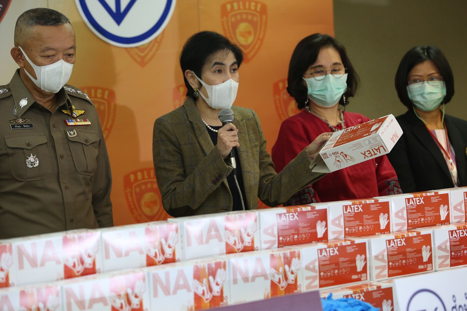 เมื่อวันที่ 12 มกราคม ที่กองบังคับการปราบปรามการกระทำความผิดเกี่ยวกับการคุ้มครองผู้บริโภค (บก.ปคบ.) พล.ต.ท. เพิ่มพูน ชิดชอบ ผู้ช่วยผู้บัญชาการตำรวจแห่งชาติ ในฐานะหัวหน้าคณะทำงานปราบปรามผลิตภัณฑ์และการบริการด้านสุขภาพที่ผิดกฎหมาย พร้อมด้วย พล.ต.ต. ณัฐศักดิ์ เชาวนาศัย ผบก.ปคบ., พ.ต.อ.เนติ วงษ์กุหลาบ ผกก.4 บก.ปคบ., สำนักงานคณะกรรมการอาหารและยา (อย.) และกระทรวงสาธารณสุข โดย ภญ.สุภัทรา บุญเสริม รองเลขาธิการคณะกรรมการอาหารและยา ร่วมกันแถลงผลการทลายโกดังย่านลำลูกกา จ.ปทุมธานี ที่ลักลอบนำถุงมือใช้แล้วมาบรรจุใหม่เป็นถุงมือทางการแพทย์ ยี่ห้อ NA รวมมูลค่าของกลางกว่า 100 ล้านบาท