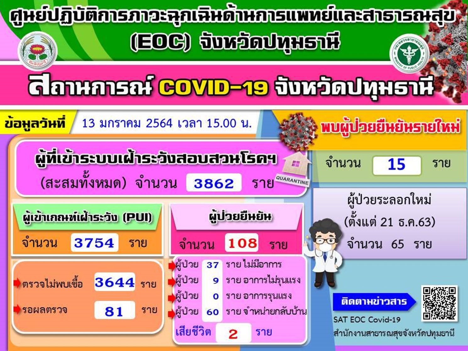 เมื่อวันที่ 13 ม.ค.สำนักงานสาธารณสุขจังหวัดปทุมธานี รายงานสถานการณ์โรคโควิด-19 ณ เวลา 15.00 น.ว่า พบผู้ติดเชื้อรายใหม่จำนวน 15 ราย จากการดำเนินงานเชิงรุก active case finding ในแรงงานข้ามชาติตลาดสุชาติ และตลาดพรพัฒน์ ต.ประชาธิปัตย์ อ.ธัญบุรี กลับบ้านได้เพิ่มอีก 8 ราย