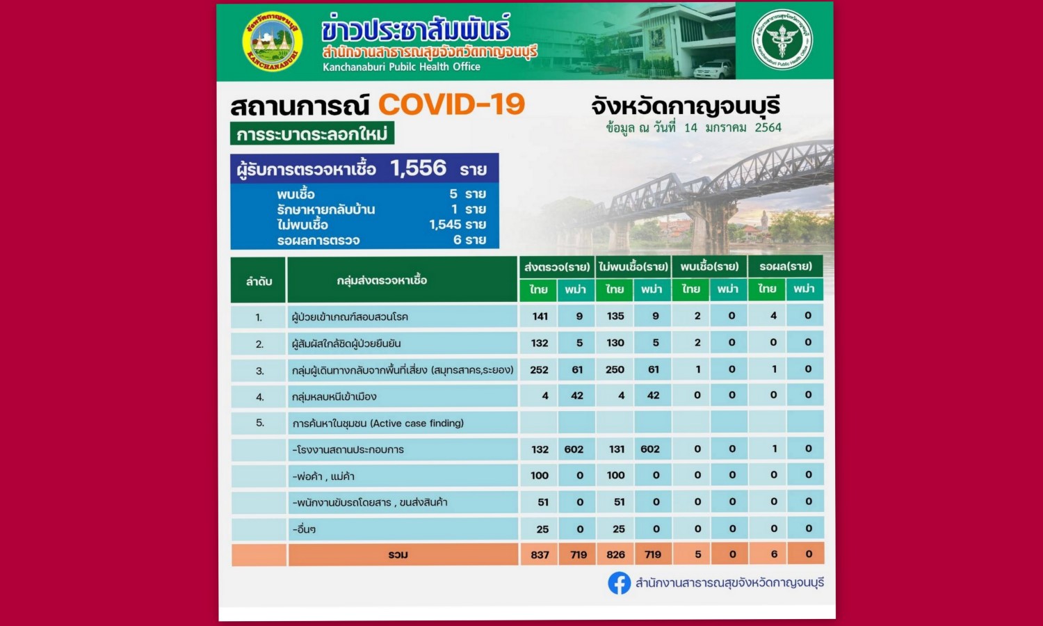 สถานการณ์การระบาดระลอกใหม่ของจังหวัดกาญจนบุรี ข้อมูลเมื่อวันที่ 14 ม.ค.64 มีผู้เข้ารับการตรวจหาเชื้อ จำนวน 1,556 ราย ไม่พบเชื้อ จำนวน 1,545 ราย พบเชื้อ 5 ราย 1 ใน 5 ราย รักษาหายกลับบ้านได้แล้ว และยังต้อรอผลการตรวจอีก 6 ราย เป็นชาวไทยทั้งหมด