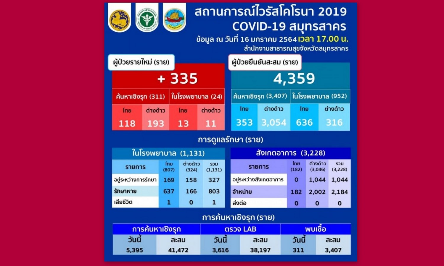 วันที่ 16 มกราคม 2564 เวลา 17.00 น. สถานการณ์การติดเชื้อ COVID-19 สมุทรสาคร ผู้ป่วยรายใหม่ 335 ราย ...