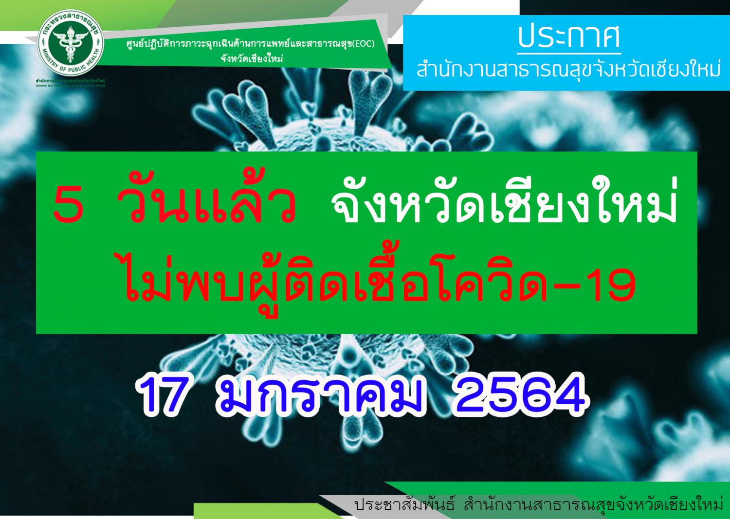 เมื่อวันที่ 17 ม.ค.นายวีระพันธ์? ดีอ่อน รองผู้ว่าราชการจังหวัดเชียงใหม่ เปิดเผยว่า ขณะนี้จ.เชียงใหม่?เริ่มมีสัญญาณดีต่อเนื่องหลังจากไม่พบผู้ติดเชื้อโควิด-19 รายใหม่ติดต่อกันเป็นวันที่ 5 แล้ว แต่ก็ไม่ควรประมาท?หรือวางใจจนการ์ด?ตก? ยังต้องช่วยกันเฝ้าระวัง?ป้องกัน?การระบาดของโควิด-19? ต่อไปภายใต้มาตรการ?ขณะนี้?