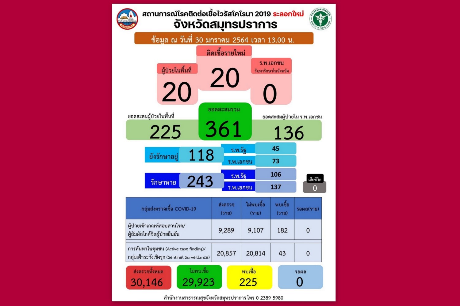 เมื่อวันที่ 30 ม.ค.64 สำนักงานสาธารณสุขจังหวัดสมุทรปราการ รายงานพบผู้ป่วยโควิดรายใหม่ในพื้นที่จังหวัดสมุทรปราการ จำนวน 20 ราย แยกเป็น