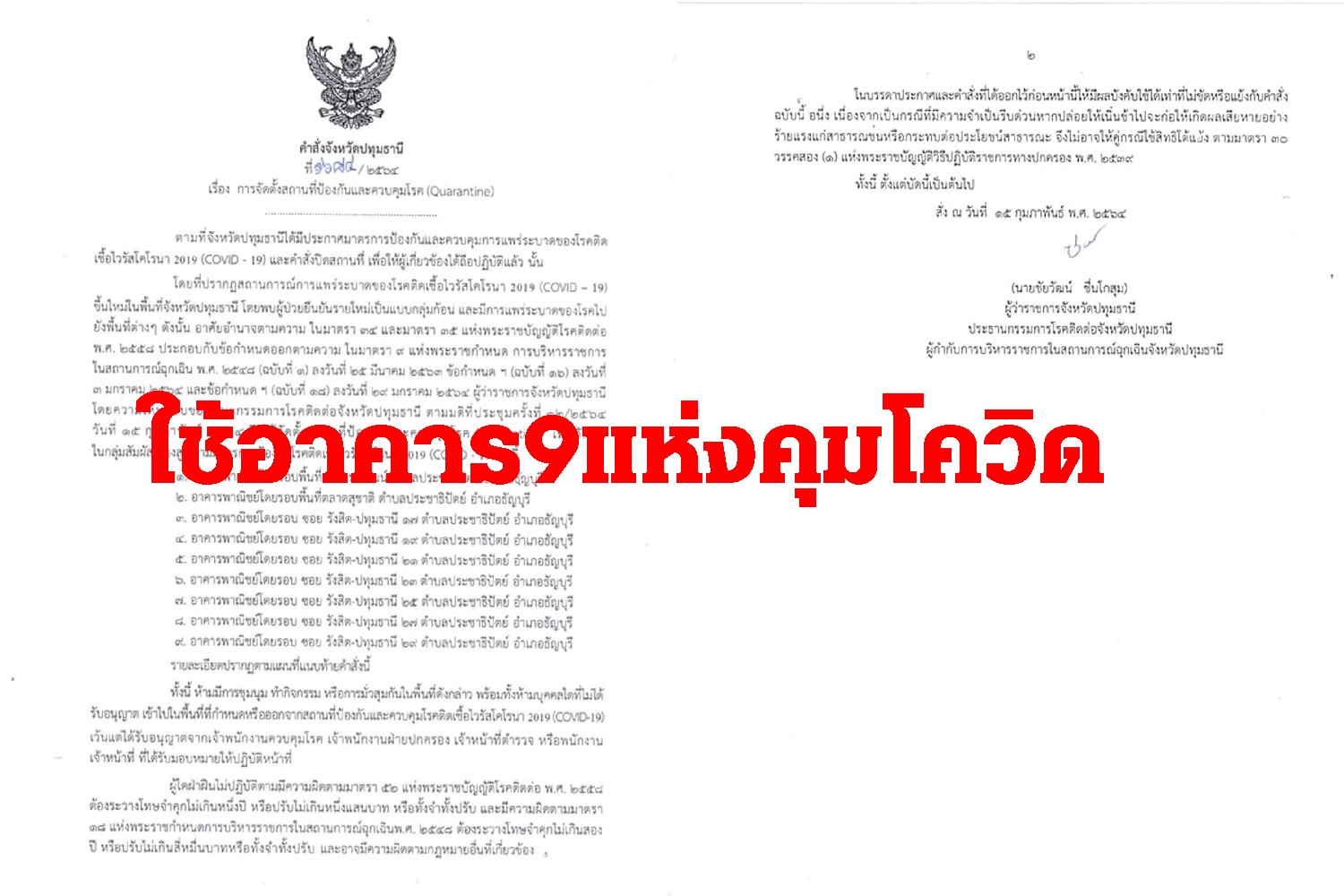 เมื่อวันที่ 16 ก.พ.64 สำนักงานสาธารณสุขจังหวัด เผยเอกสารคำสั่งจังหวัดปทุมธานี เรื่อง การจัดตั้งสถานที่ป้องกันและควบคุมโรค (Quarantine) ลงนามโดยผู้ว่าราชการจังหวัดปทุมธานี นายชัยวัฒน์ ชื่นโกสุม ใจความสำคัญว่า เพื่อกักกันในกลุ่มสัมผัสเสี่ยงสูง ตามมาตรการป้องกันโควิด-19 จึงให้จัดตั้งสถานที่ป้องกันและควบคุมโรค อาคารพาณิชย์ ทั้งหมด 9 แห่งดังนี้