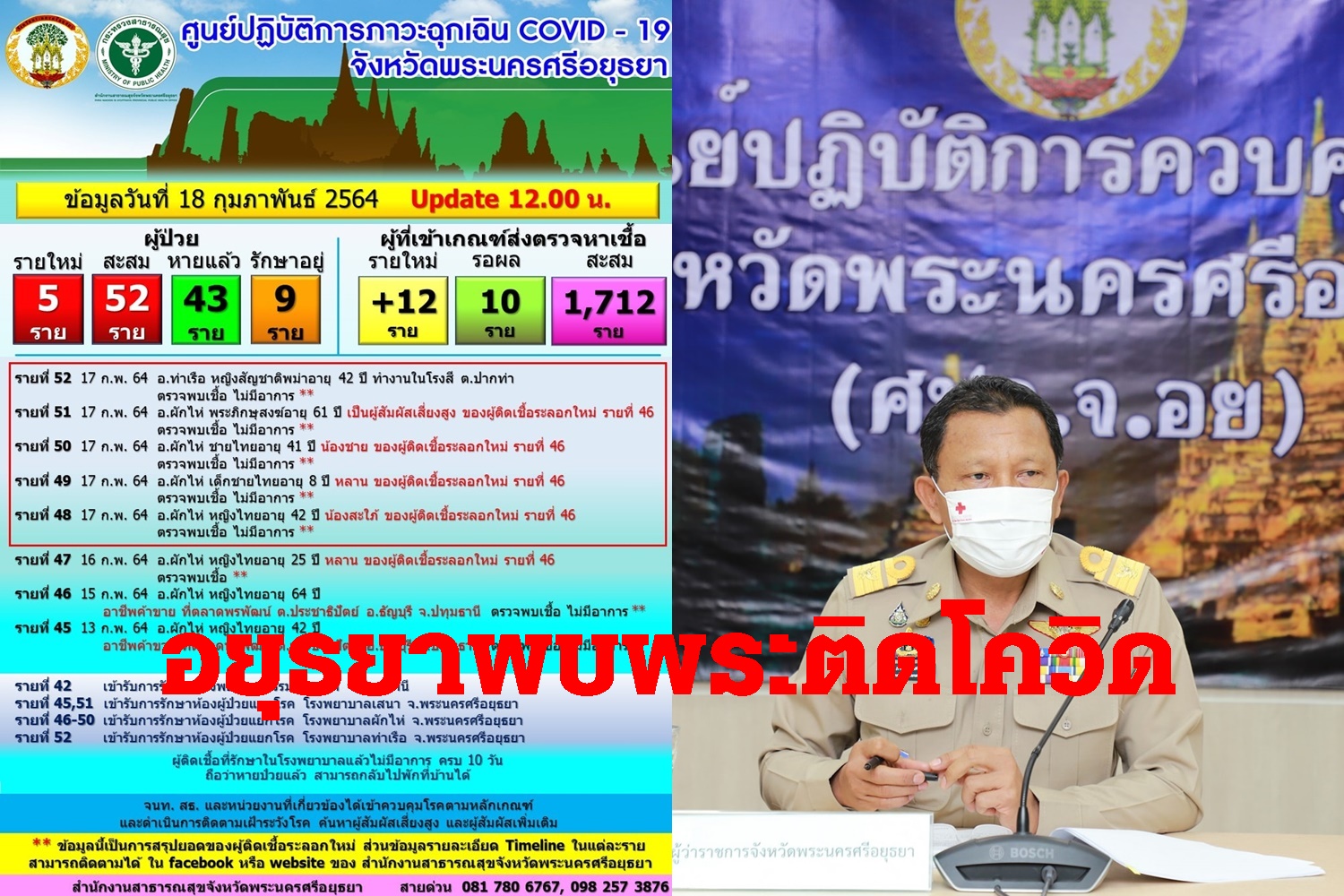 เมื่อวันที่ 18 กุมภาพันธ์ 64 นายภานุ แย้มศรี ผู้ว่าราชการ จ.พระนครศรีอยุธยา ได้ออกประกาศแจ้งเตือนถึงประชาชนในพื้นที่ว่า วันนี้พบผู้ติดเชื้อโควิด รายใหม่เพิ่มขึ้นอีก 5 คน ทำให้ยอดสะสมผู้ติดเชื้อโควิดระลอกที่ 2 มีรวม 52 คนแล้ว รักษาตัวจนหายขาด 43 คน และยังคงพักรักษาตัวในโรงพยาบาลอีก 9 คน