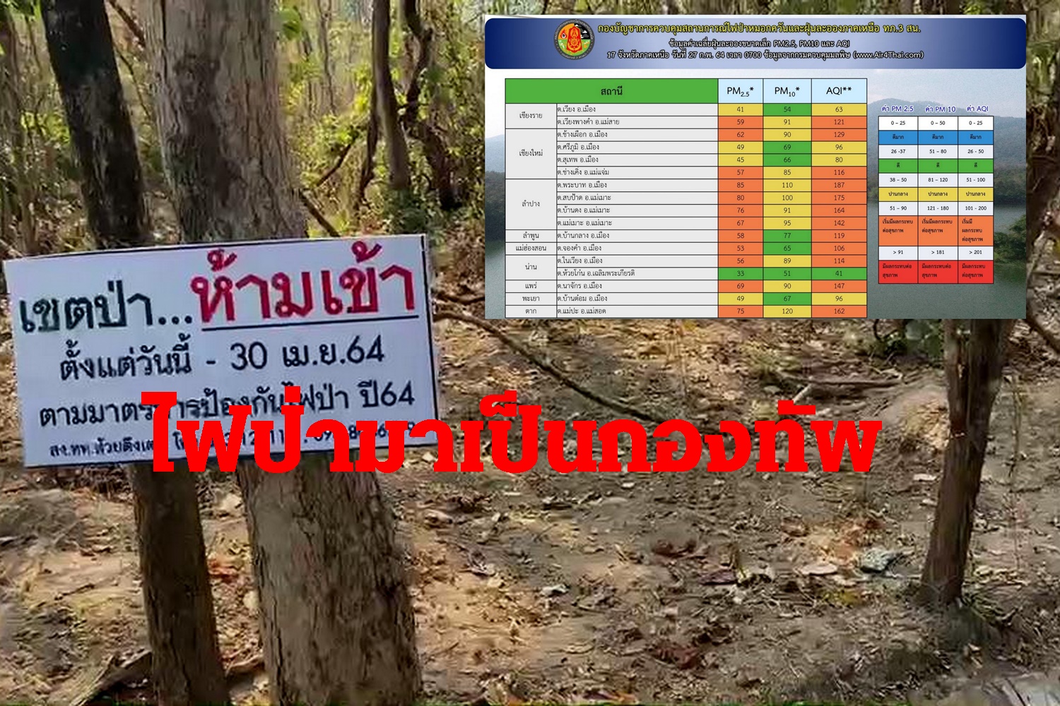 เชียงใหม่-สถานการณ์ไฟป่า17จังหวัดภาคเหนือน่าเป็นห่วง กองทัพภาคที่ 3 เผยค่าคุณภาพอากาศ AQI อยู่ระหว่าง 41 – 187 มคก./ลบ.ม.