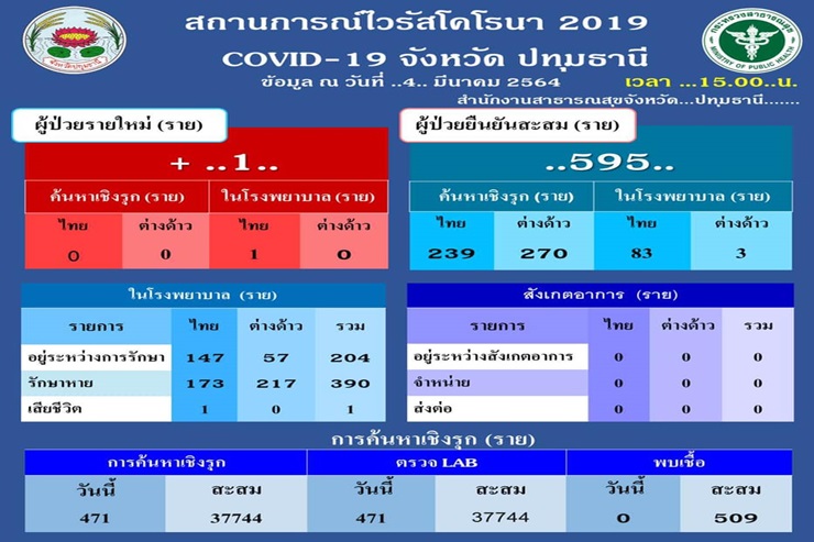 ปทุมธานี- สาธารณสุขปทุมธานีเผยพบผู้ติดเชื้อโควิด-19 เพิ่ม 1 ราย ยอดสะสม 595 ราย ค้นหาเชิงรุกไปแล้ว 37,744 ราย