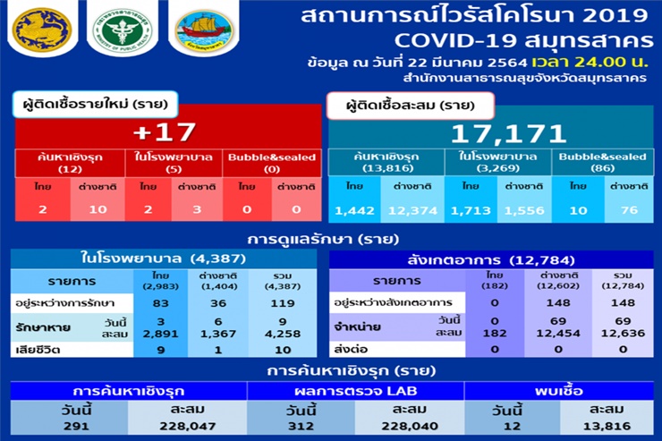 เมื่อวันที่ 23 มี.ค.64 จังหวัดสมุทรสาคร รายงานข้อมูลจำนวนผู้ติดเชื้อโควิด-19 ณ เวลา 24.00 น. วันที่ 22มีค. 64 พบผู้ติดเชื้อรายใหม่ 17 ราย เป็นการพบจากการตรวจในโรงพยาบาล 5 ราย เป็นคนไทย 2 ราย ต่างชาติ 3 ราย พบผู้ติดเชื้อจากการค้นหาคัดกรองเชิงรุกในชุมชน 12 ราย เป็นคนไทย 2 ราย ต่างชาติ 3 ราย รวมยอดผู้ติดเชื้อโควิด-19 สะสมในจังหวัดสมุทรสาคร นับตั้งแต่มีการระบาดรอบใหม่อยู่ที่ 17,171 ราย เป็นการพบผู้ติดเชื้อจากการค้นหาคัดกรองเชิงรุก 13,816 ราย พบเชื้อจากการตรวจในโรงพยาบาล 3,269 ราย และ บับเบิล แอนด์ซีล 86ราย ผู้เสียชีวิตสะสม 10 ราย