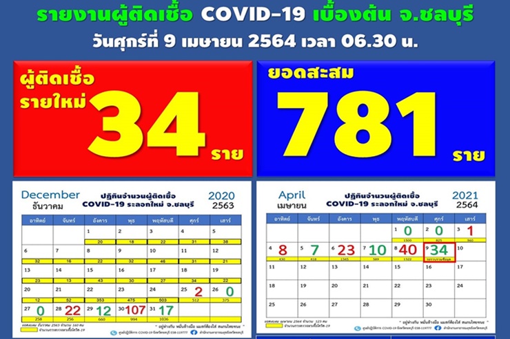 เมื่อวันที่ 9 เม.ย. 64 เพจเฟซบุ๊ก สำนักงานประชาสัมพันธ์จังหวัดชลบุรี - Chonburi PR รายงานว่า วันนี้มีรายงานผู้ป่วยโควิด-19 ยืนยันรายใหม่ 34 ราย